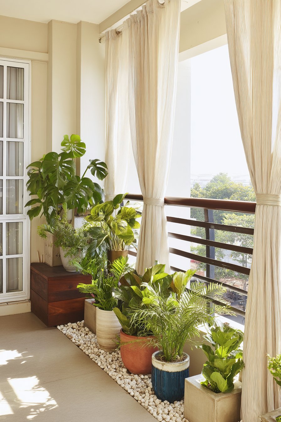 Create a vibrant indoor tropical balcony by incorporating lush plants like Monstera and ferns, paired with earthy-toned pots for a harmonious look. Enhance the space with decorative pebbles and sheer curtains to soften sunlight and add a touch of elegance.