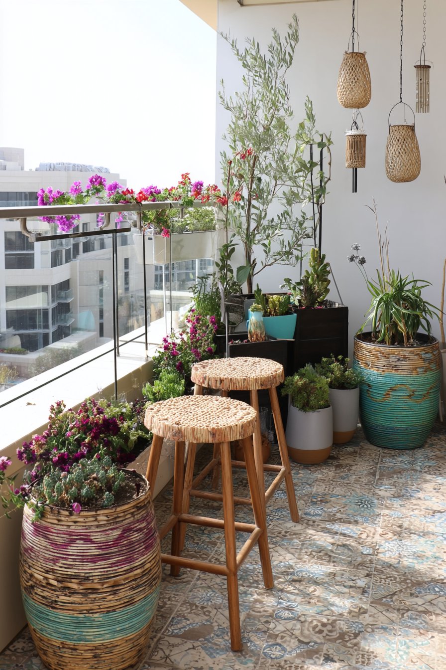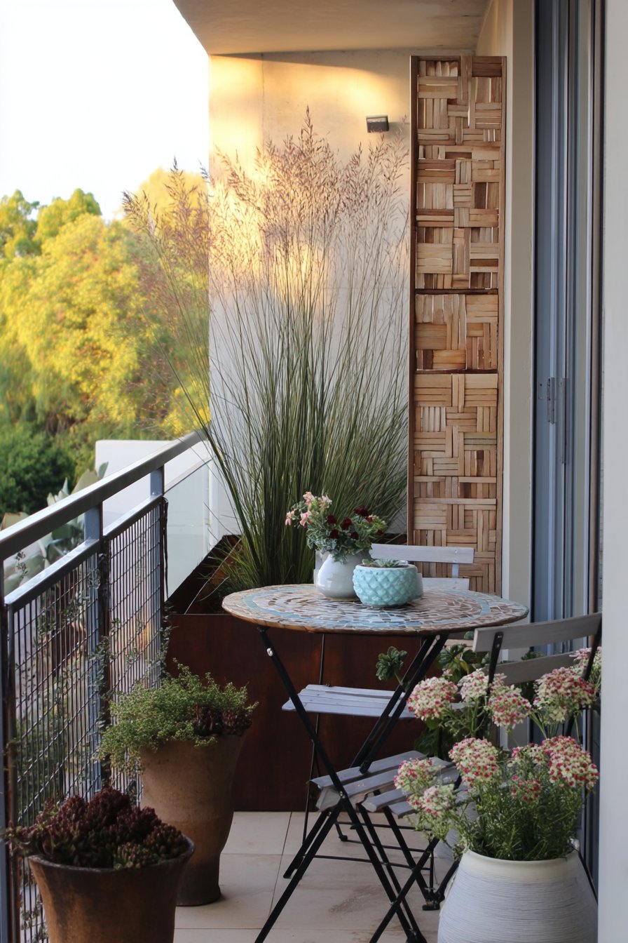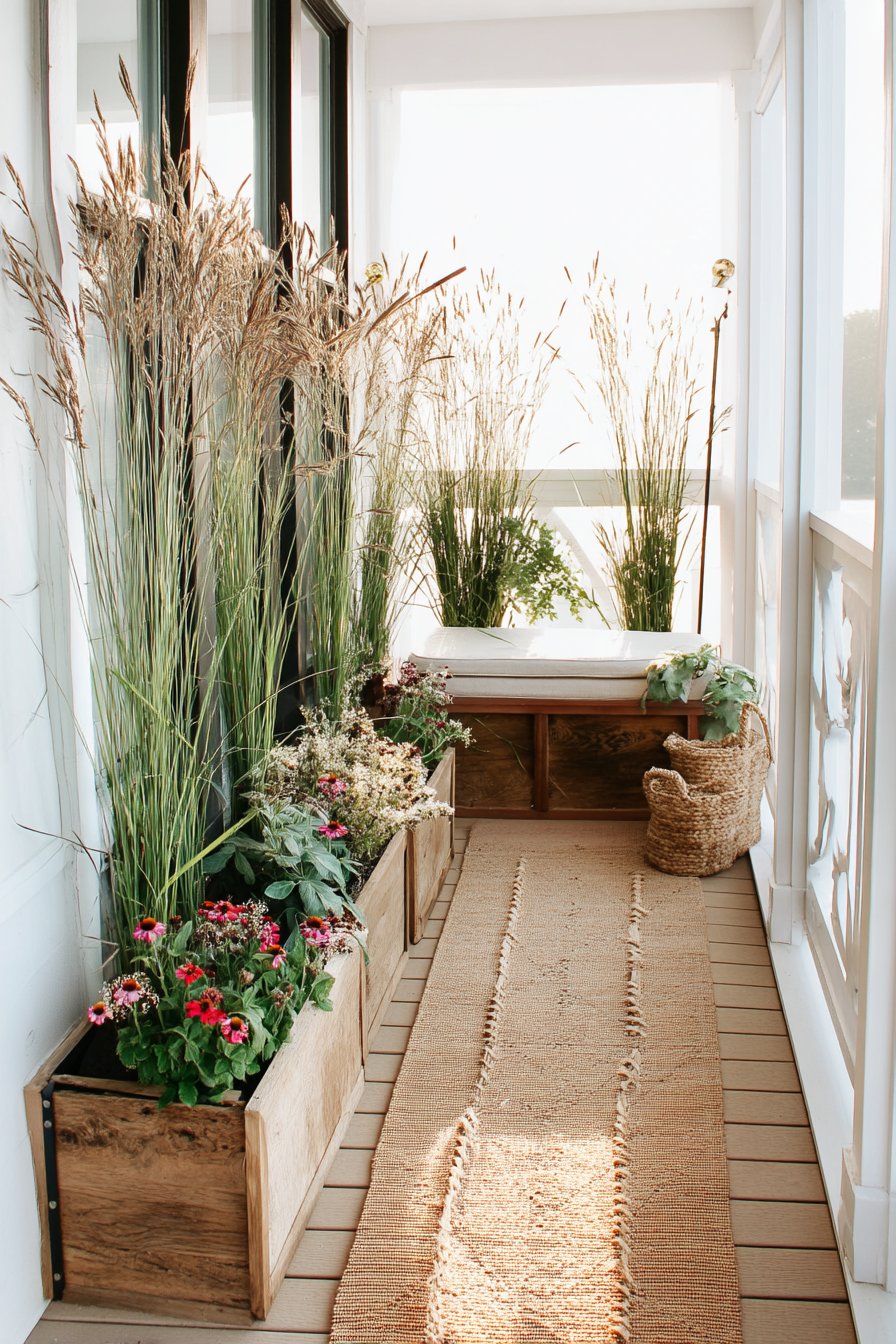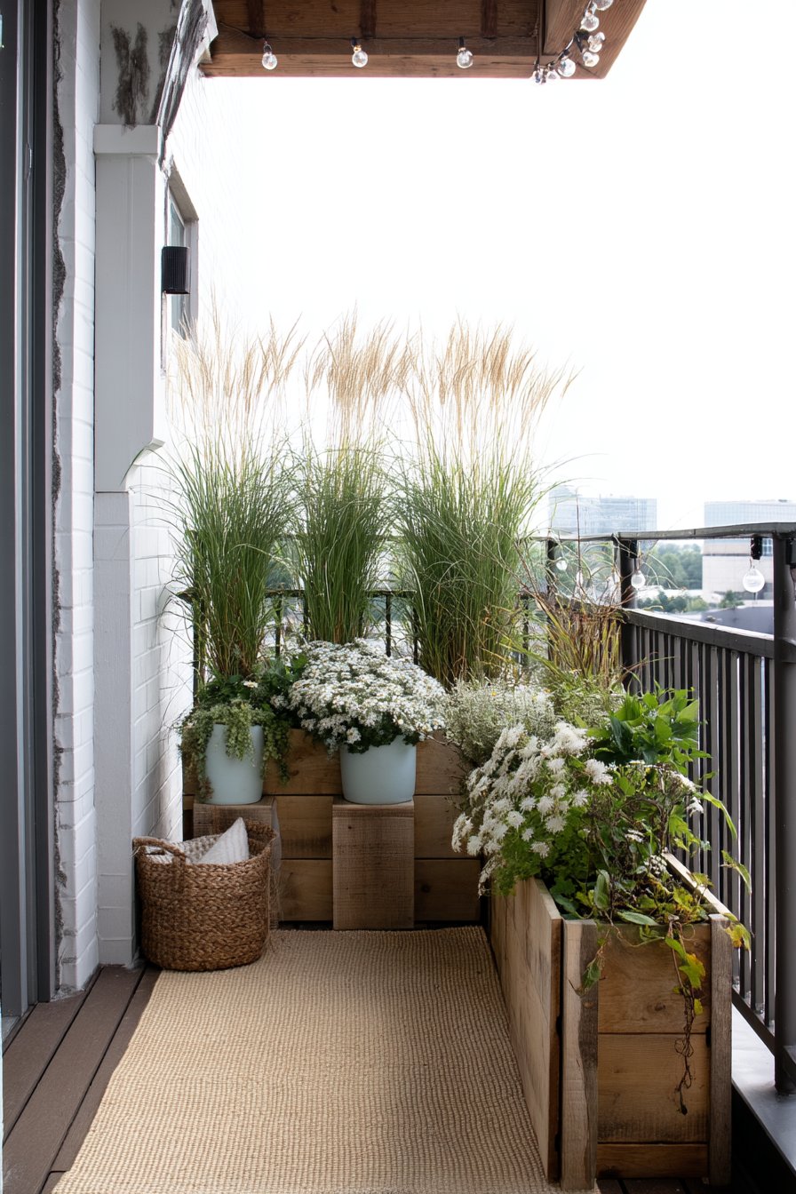 This balcony design beautifully combines tall ornamental grasses with vibrant flowering plants, creating a serene yet lively atmosphere. To replicate this look, choose drought-tolerant grasses and mix them with colorful, low-maintenance blooms in stylish pots.