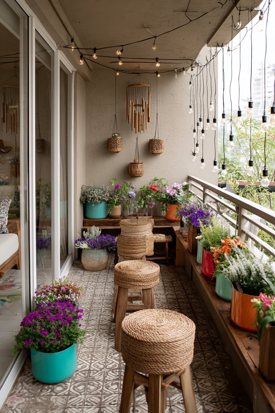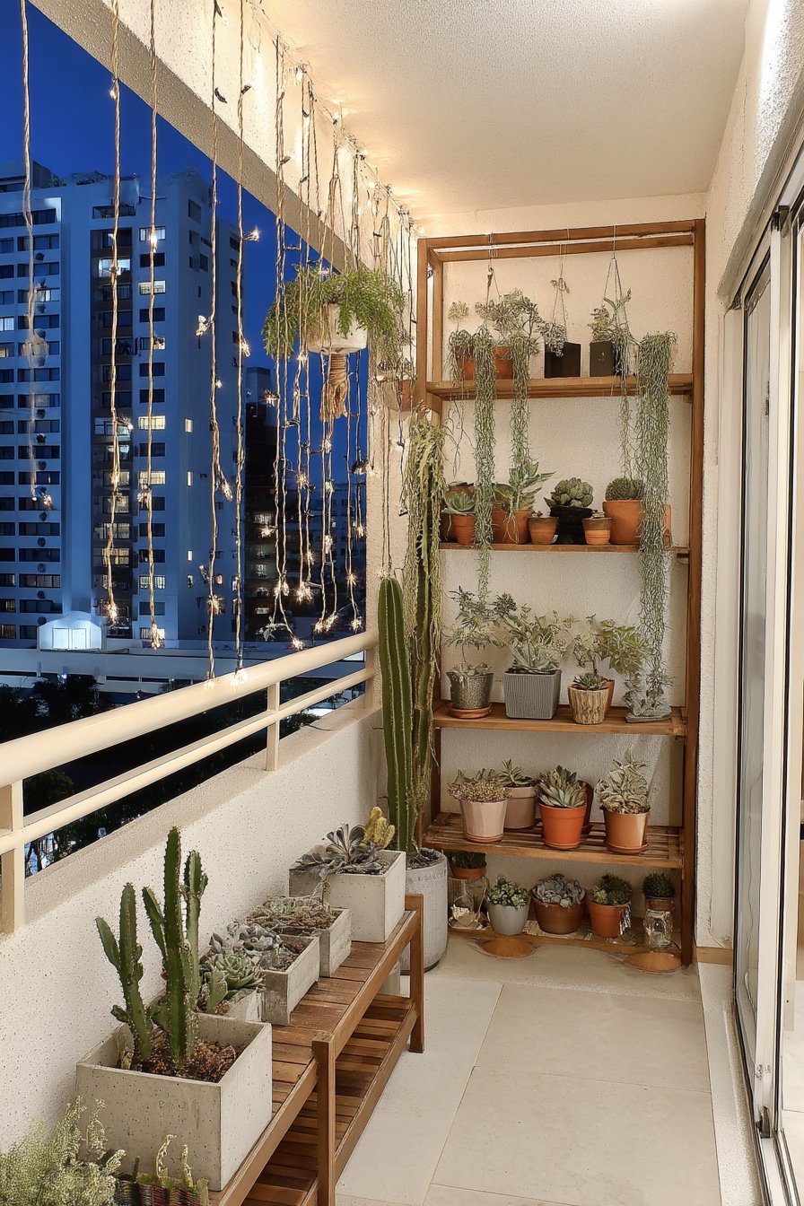 This charming balcony features an array of succulents in varied textures and colors, complemented by warm string lights that create a cozy ambiance. To replicate this look, use diverse pots and hang trailing plants to maximize vertical space while ensuring good drainage.