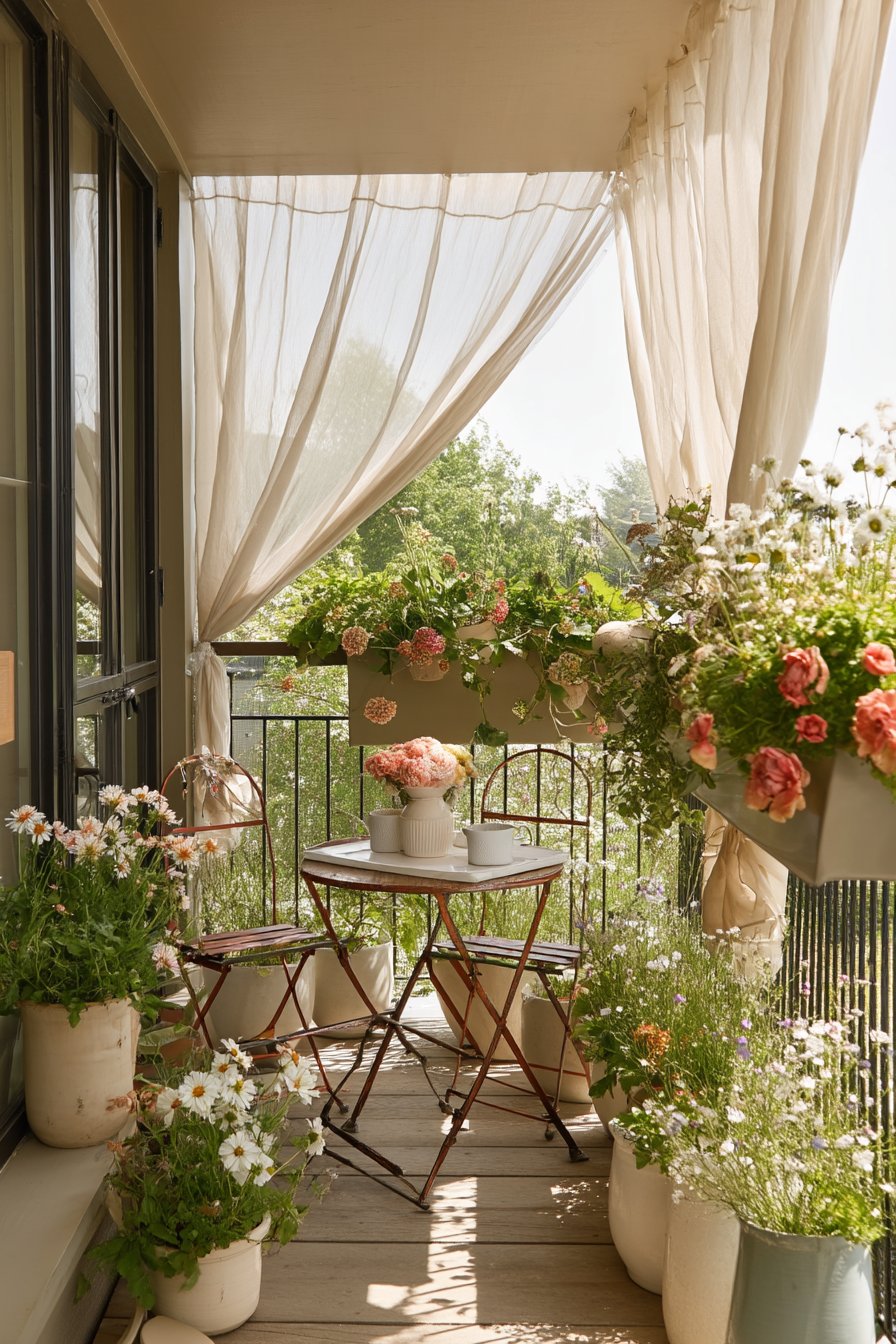 This cozy balcony features an enchanting mix of pastel flowers like geraniums and daisies, creating a vibrant yet soothing atmosphere. To replicate this look, use a variety of pots at different heights and incorporate sheer curtains for added charm and privacy.