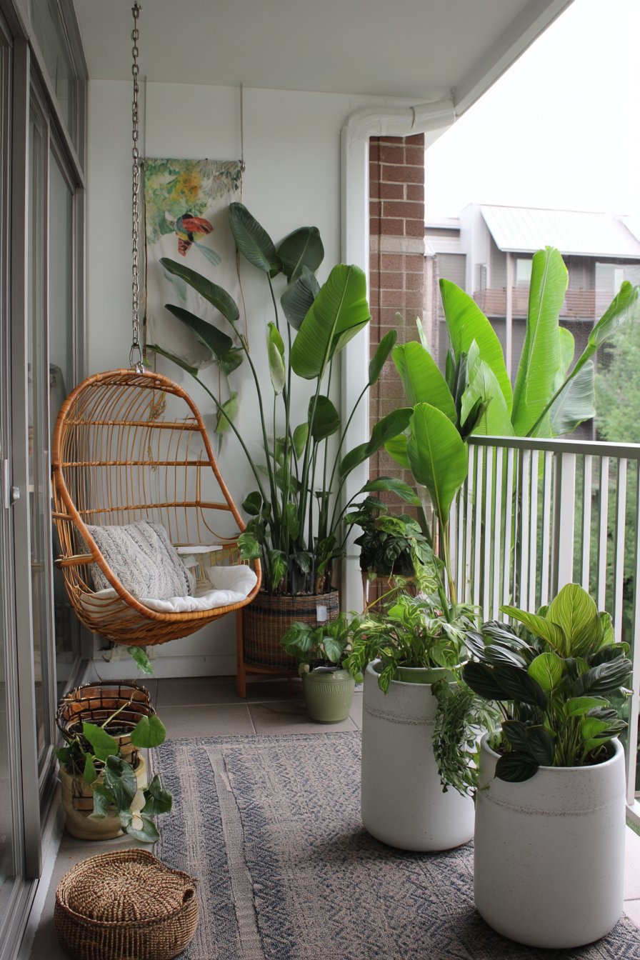 This vibrant balcony features lush tropical plants like bird of paradise and pothos, creating a serene indoor oasis. To replicate this look, use a mix of textured planters and a cozy hanging chair for relaxation.