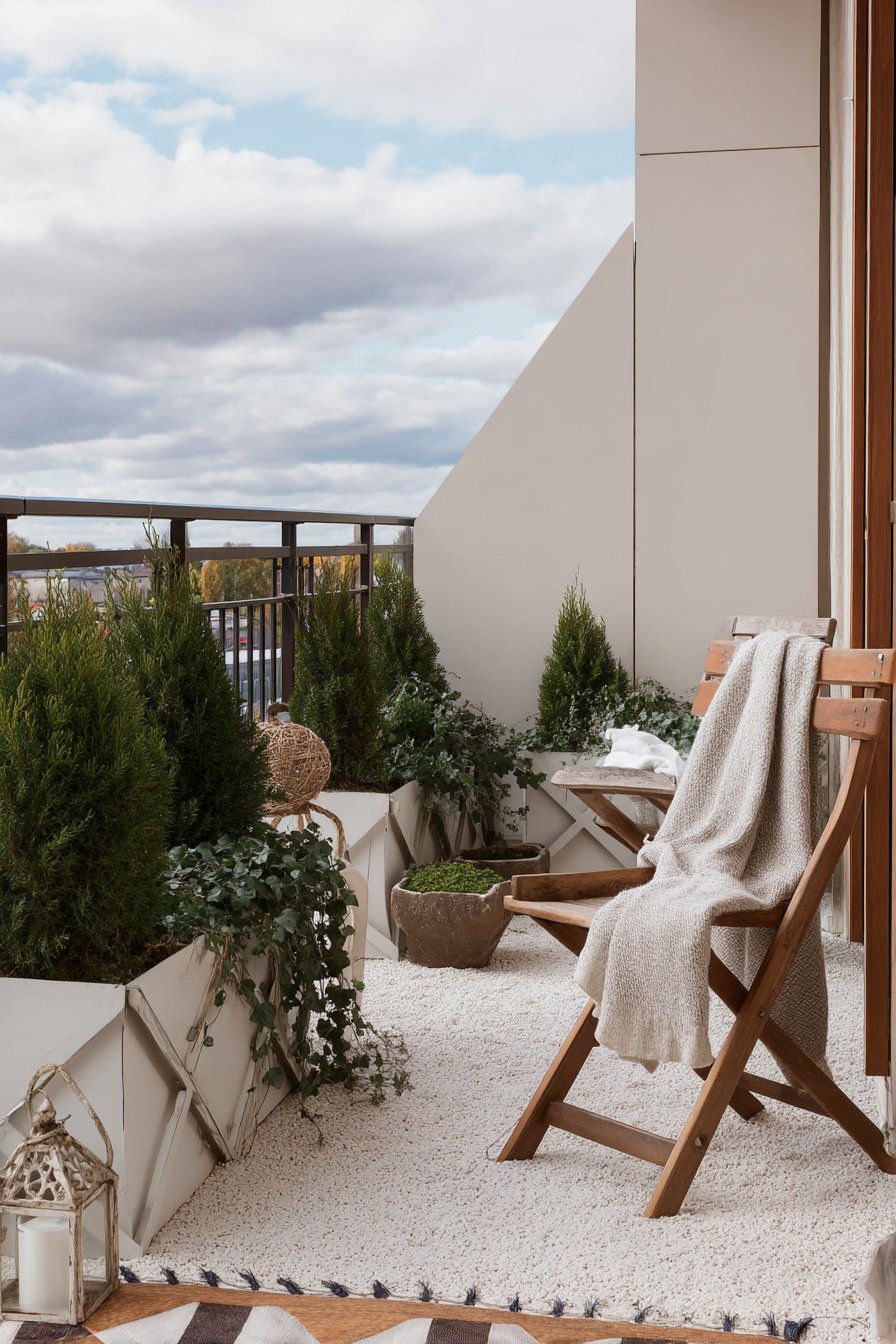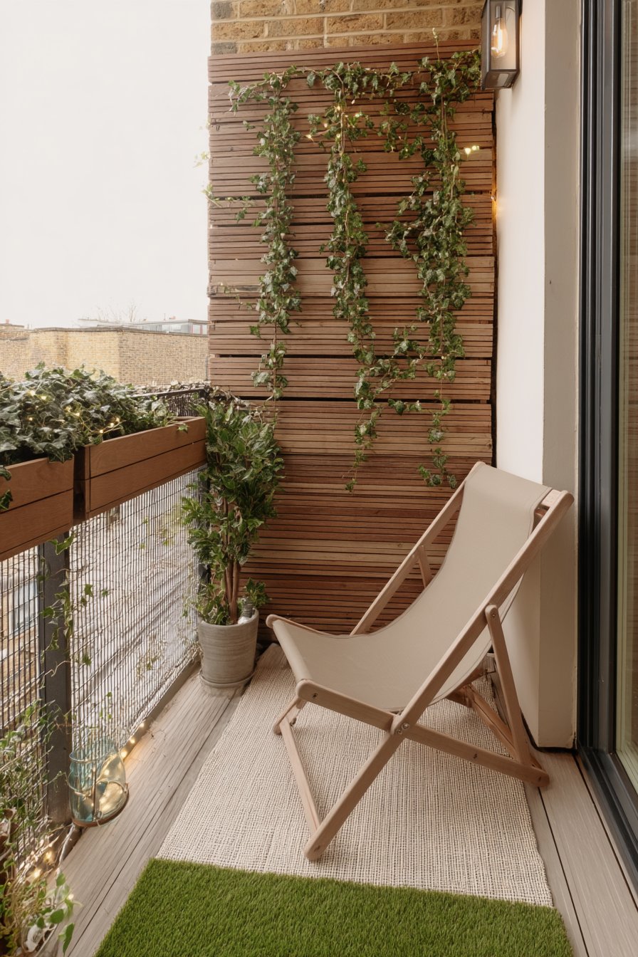 This modern minimalist balcony features lush ivy cascading down wooden panels, creating a serene oasis with a touch of greenery. To replicate this look, use vertical planters for climbing plants and incorporate natural textures like wood and woven textiles for warmth.