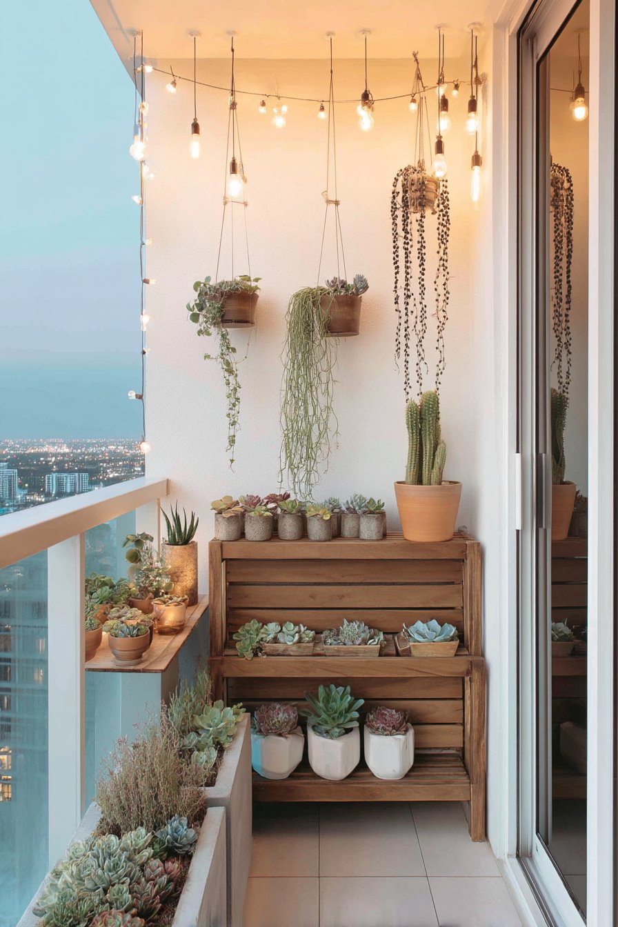 Create a serene oasis with a mix of vibrant succulents like Echeveria and trailing string of pearls, complemented by warm wooden accents. Incorporate soft lighting with hanging bulbs to enhance the ambiance, making your balcony a perfect retreat.