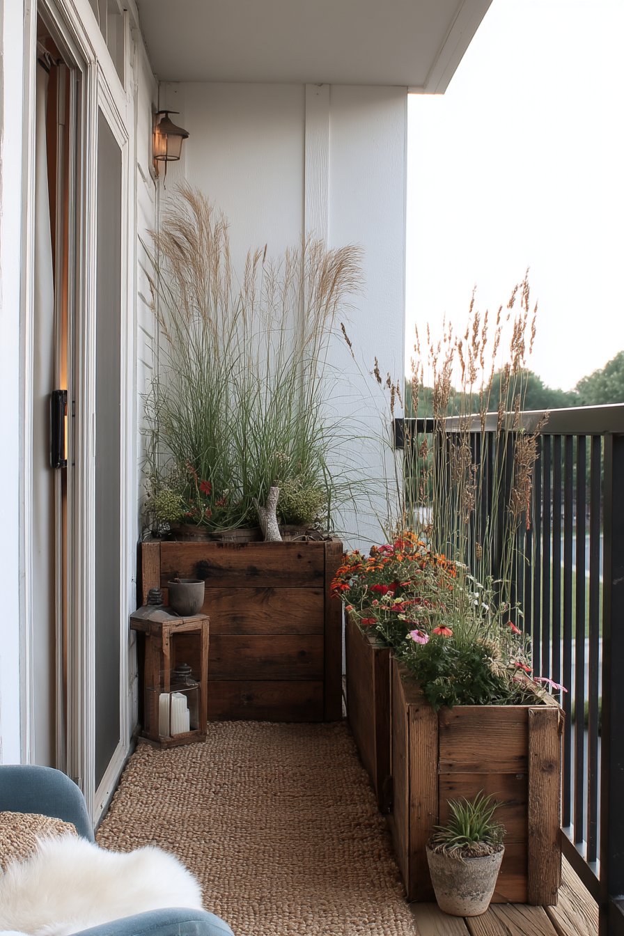 This balcony garden beautifully combines soft grasses and vibrant flowers like marigolds and geraniums in rustic wooden planters, creating a warm, inviting atmosphere. For a similar look, use varied heights in your plant selections and incorporate natural materials for a cozy, organic feel.