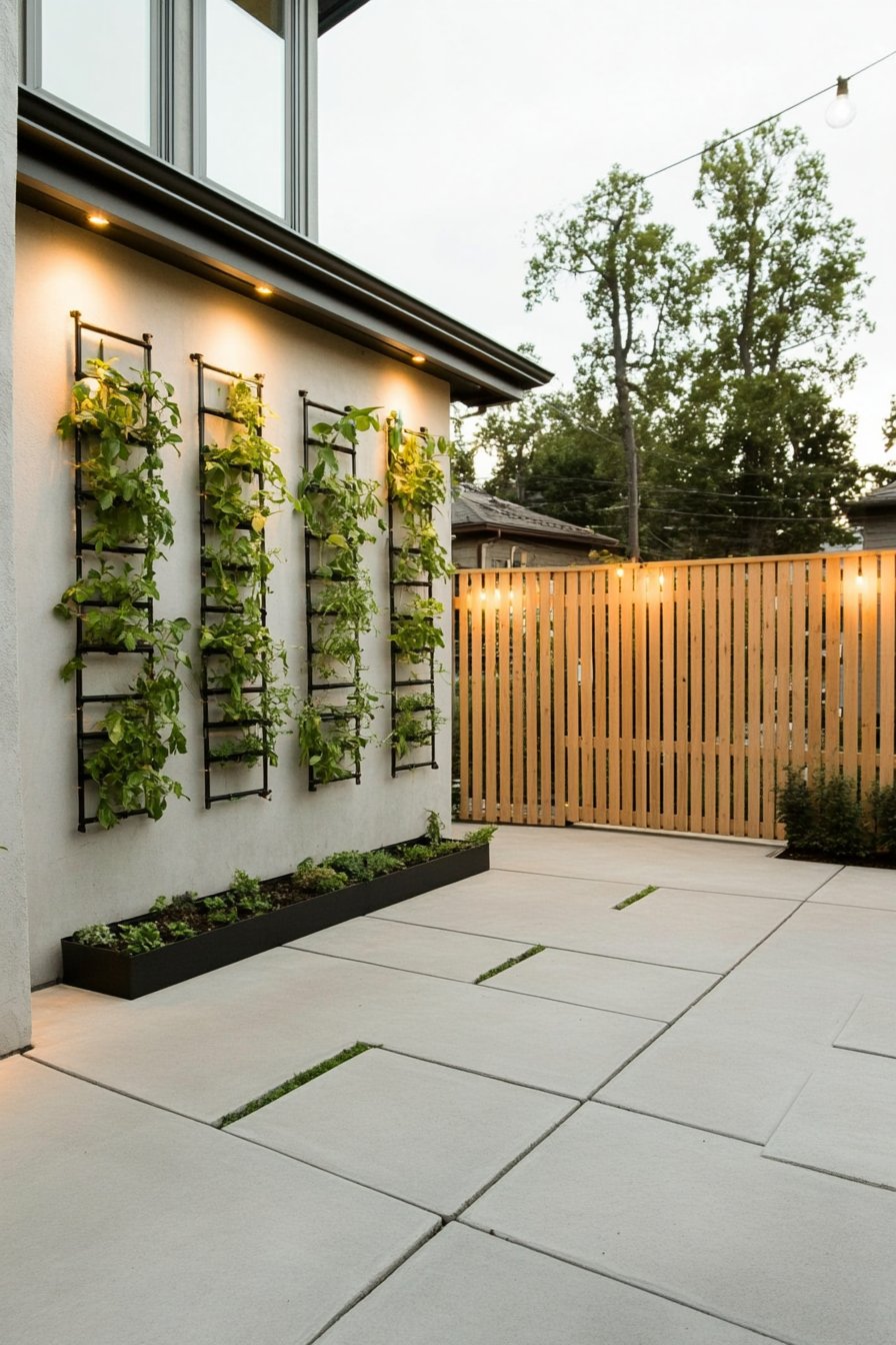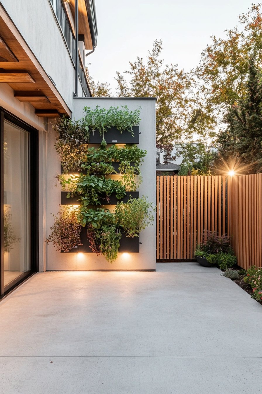 I absolutely adore the concept of a vertical herb wall, where lush greens like basil, mint, and thyme cascade beautifully, creating a living tapestry that’s both functional and aesthetically pleasing. The sleek black planters contrast strikingly with the vibrant foliage, enhanced by warm lighting that brings the garden to life as dusk falls.