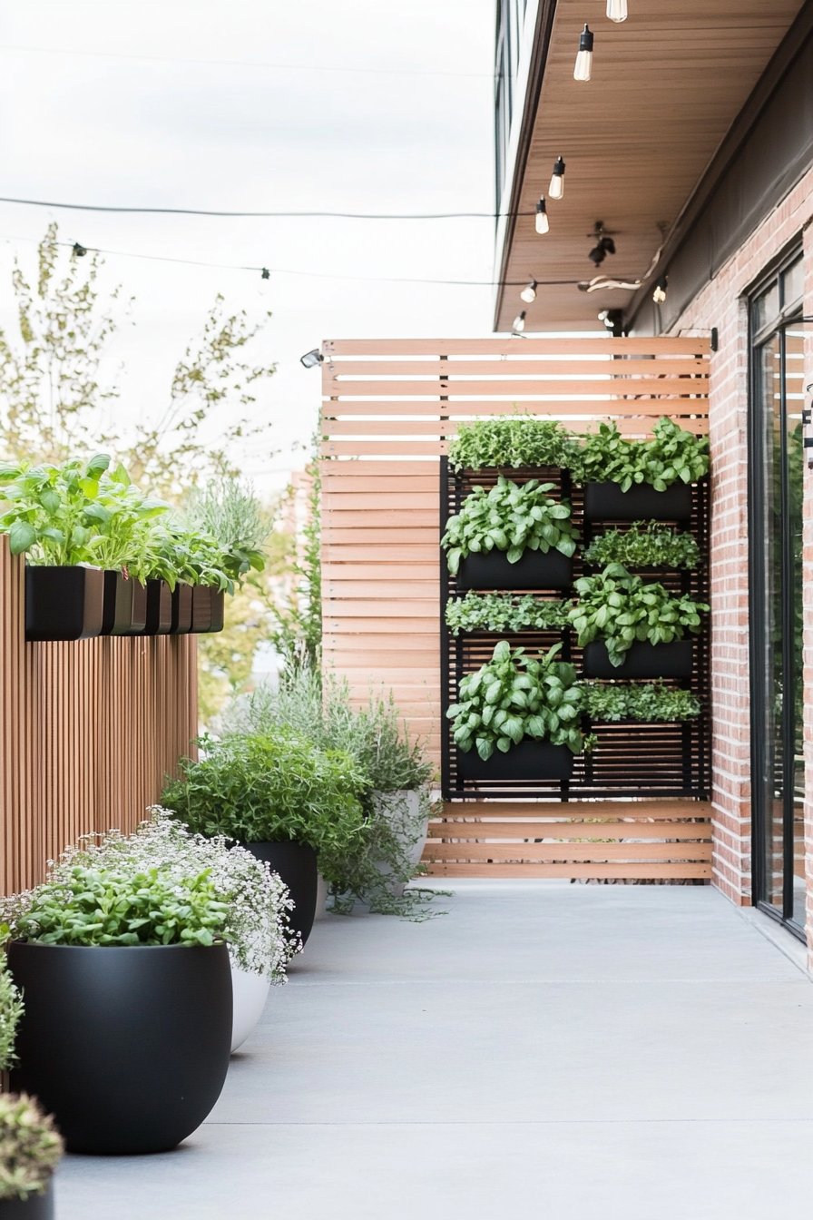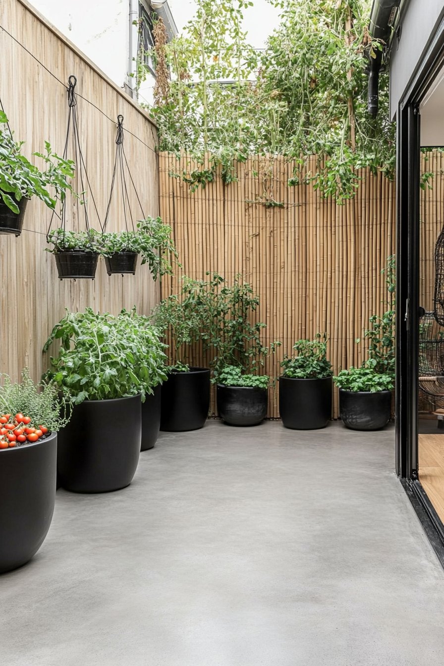 I absolutely adore the sleek, modern vibe created by the bold black planters filled with vibrant herbs like basil, thyme, and luscious cherry tomatoes, offering both aesthetic appeal and culinary delight. The combination of vertical and horizontal greenery against the warm bamboo backdrop creates a perfect harmony, making the space feel both inviting and alive.