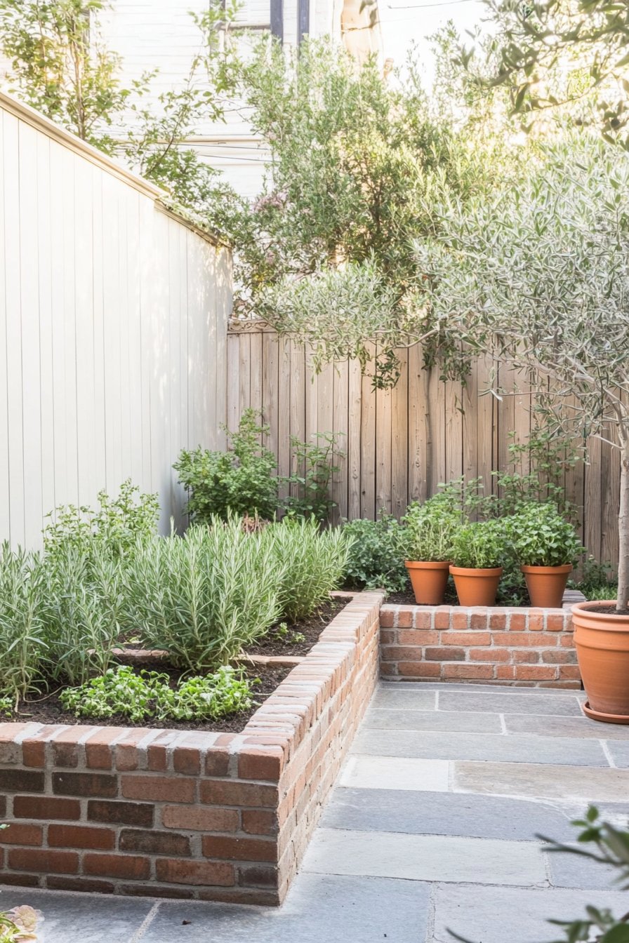 To recreate this inviting space, consider using raised beds for easy maintenance and terracotta pots for added texture and warmth. Incorporating a mix of herbs and perhaps a few flowering plants will enhance visual interest while providing fresh ingredients right at your fingertips.
