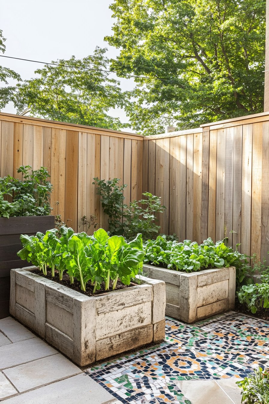 The design captivates with its rustic charm, showcasing vibrant greens of Swiss chard and lush spinach nestled in beautifully aged concrete beds, creating an inviting urban oasis. The mosaic pathway adds a splash of color, harmonizing with the natural wood fence that provides a sense of privacy and warmth.