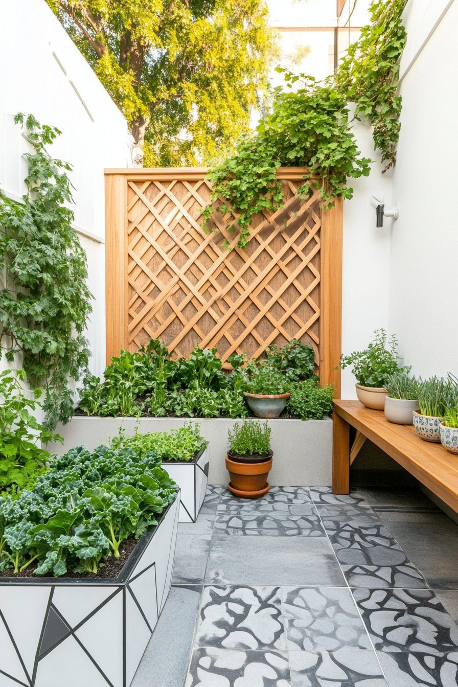 The vibrant mix of herbs and leafy greens, like kale and basil, creates a lush, inviting atmosphere that draws you in. I love how the geometric planters and warm wooden accents provide a modern touch, making this space not just functional but visually stunning.
