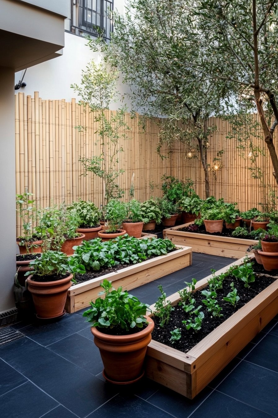 This garden exudes a charming rustic vibe, featuring warm wooden raised beds filled with vibrant herbs like basil, mint, and rosemary, all complemented by terracotta pots that add an earthy touch. The backdrop of bamboo fencing not only provides privacy but also infuses a natural elegance, creating an inviting sanctuary in an urban setting.