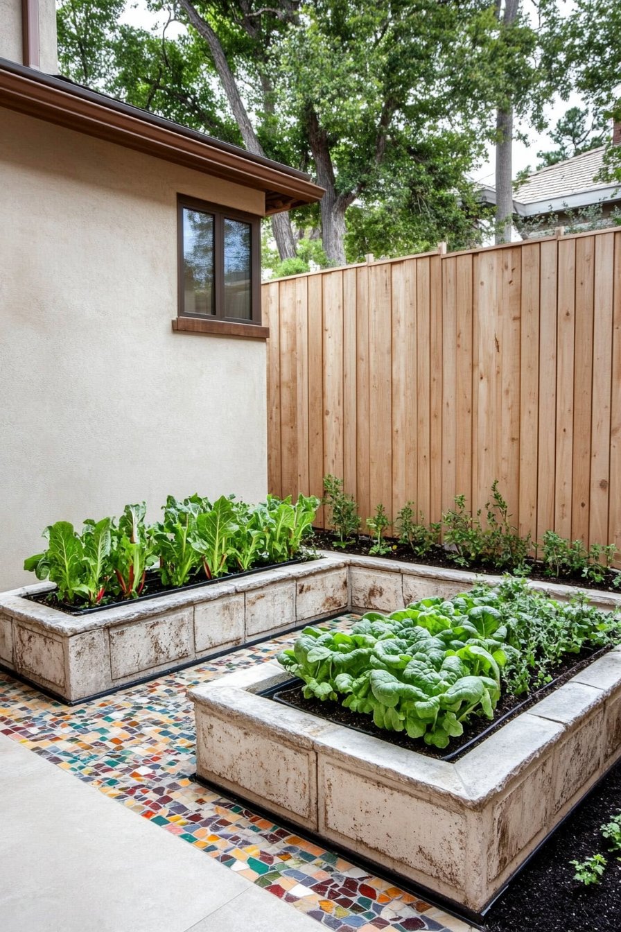 I absolutely love the vibrant combination of raised concrete planters brimming with lush greens like Swiss chard and radishes, perfectly set against a backdrop of natural wood fencing. The mosaic tile pathway adds a splash of color and character, making this garden not just functional but a true visual delight.
