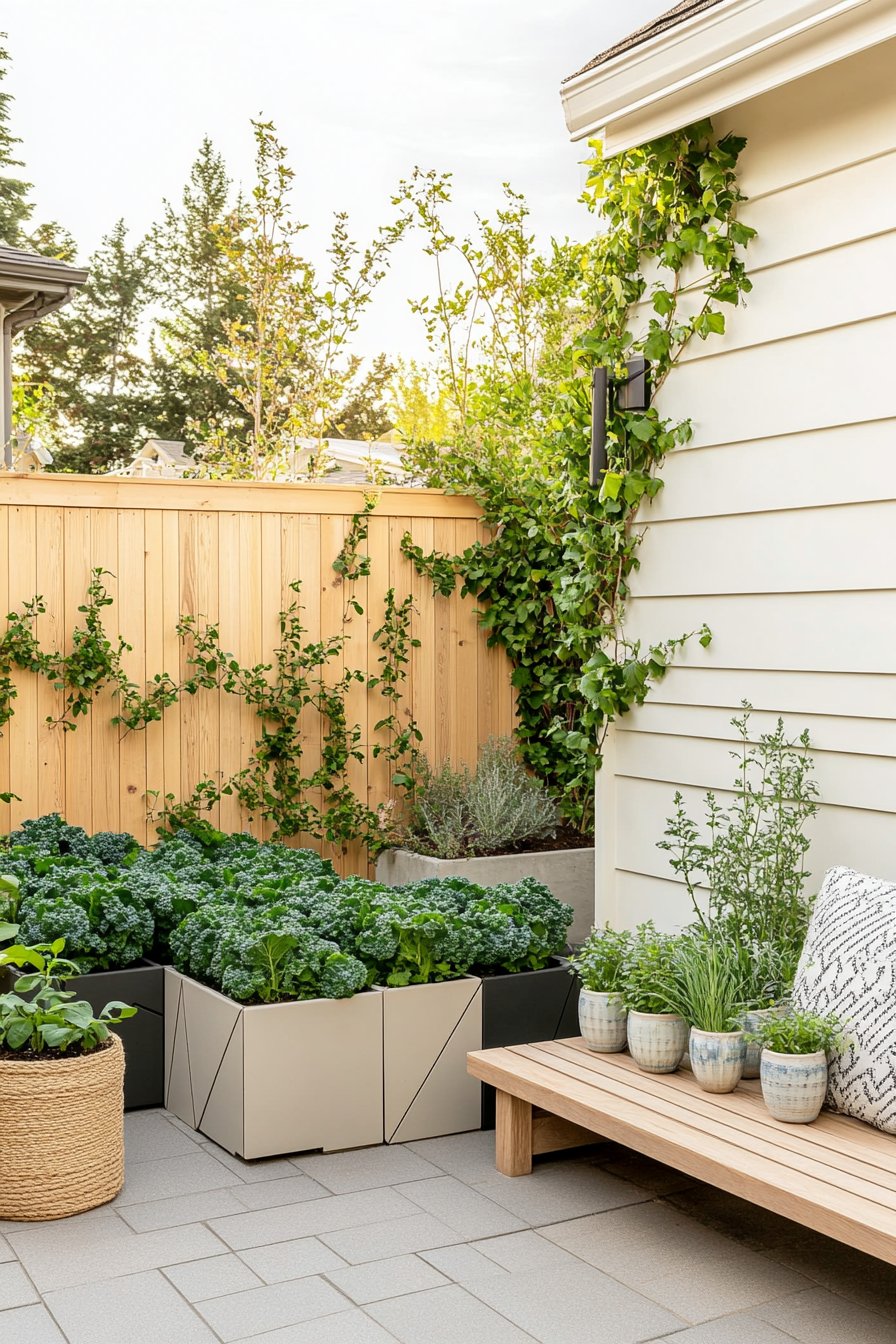The design captivates with its contemporary aesthetic, featuring sleek, geometric planter boxes filled with vibrant kale and aromatic herbs, creating a lush oasis that’s both functional and beautiful. The warm tones of the wooden fence complement the greenery, while the integrated seating area invites relaxation amidst the bounty of nature.