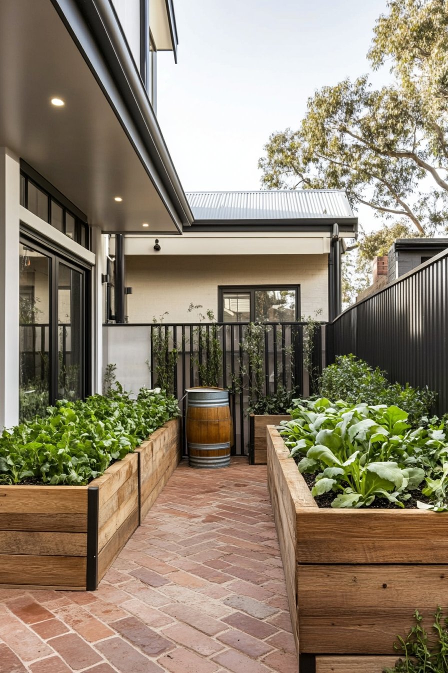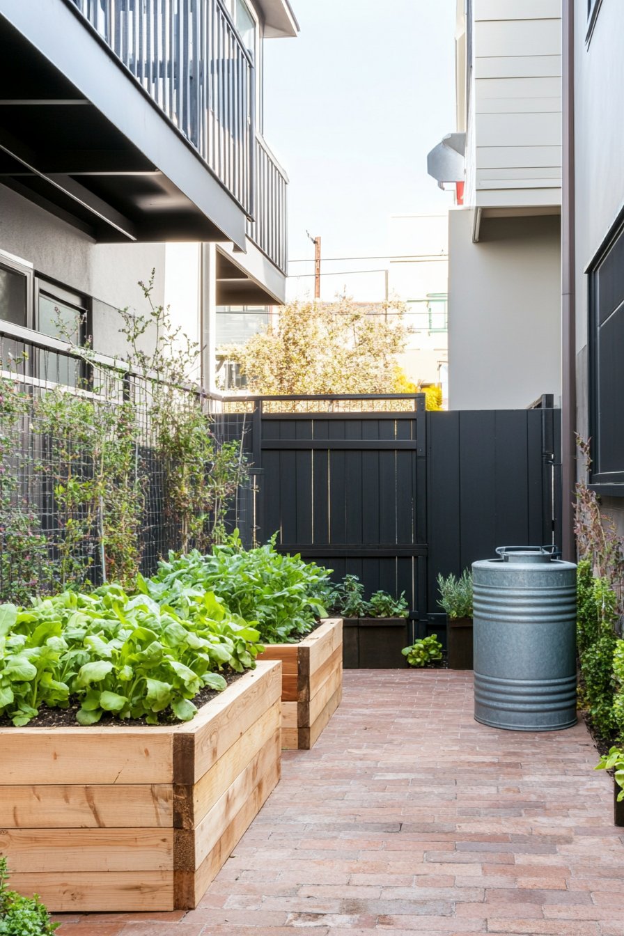 This garden design beautifully blends rustic charm with urban functionality, featuring raised wooden beds overflowing with vibrant greens like lettuce and arugula. The warm tones of the wood contrast perfectly with the sleek black fence, creating an inviting atmosphere that’s both practical and aesthetically pleasing.