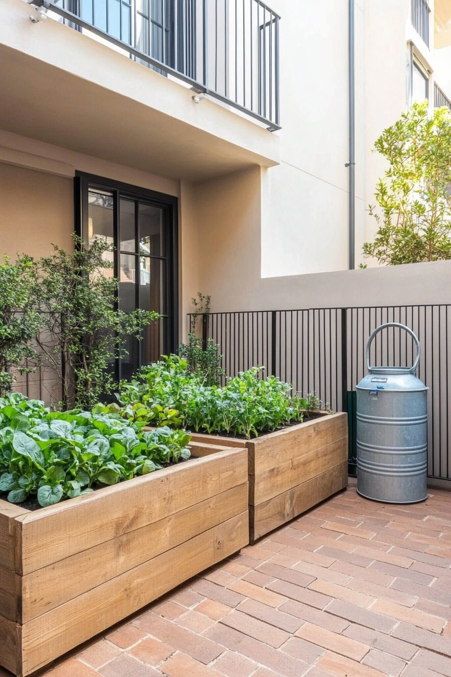 To achieve a similar look at home, consider incorporating raised beds made from untreated wood and planting a variety of leafy greens for easy maintenance and quick harvests. Adding a stylish watering can as a functional accessory not only enhances the aesthetic but also keeps your plants thriving!