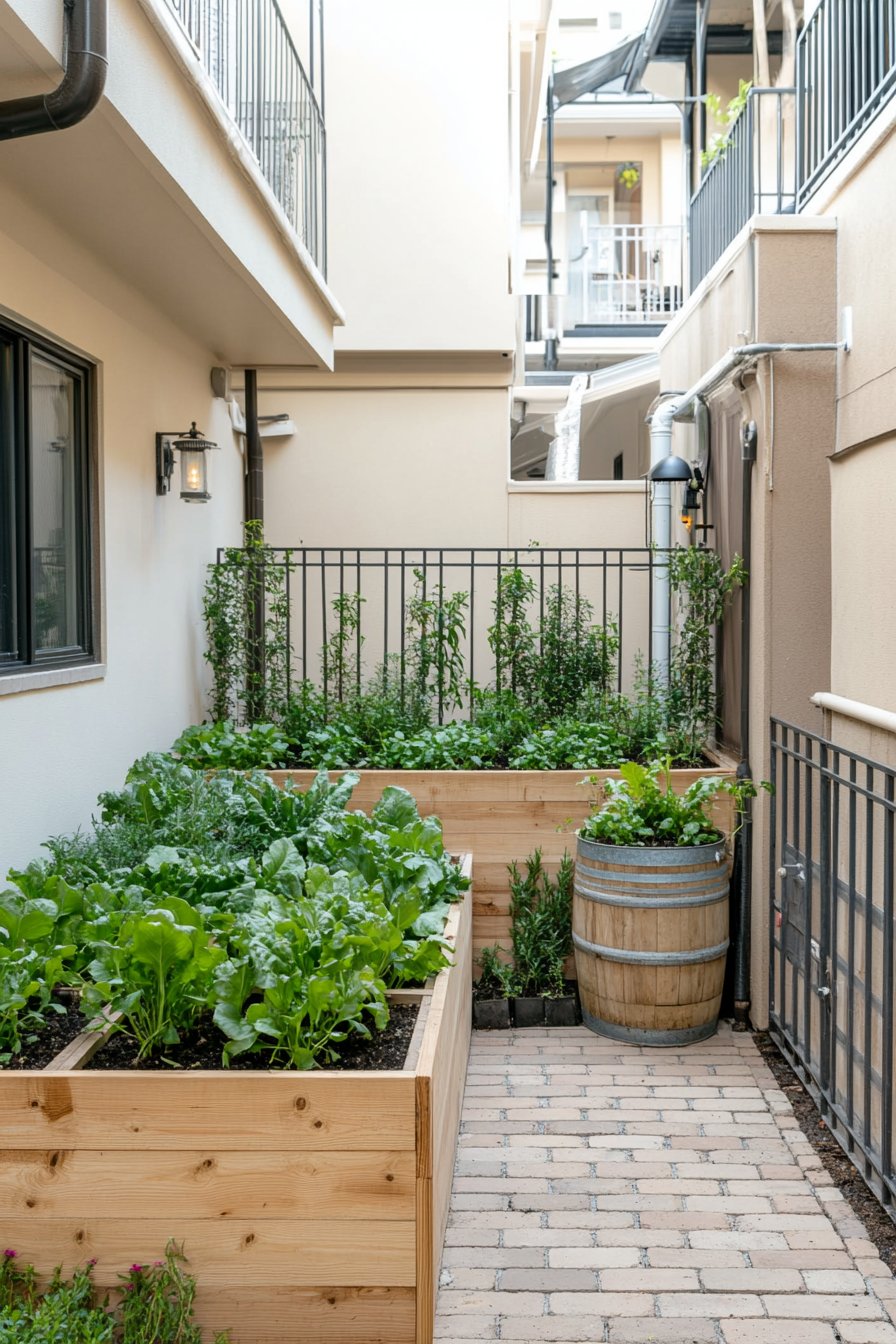 This urban edible oasis captivates with its warm, natural wood raised beds overflowing with vibrant greens like arugula, kale, and fresh herbs, creating a lush tapestry in a compact space. The clever use of a wooden barrel planter adds a rustic touch, while the charming brick pathway invites exploration and connection with the plants.