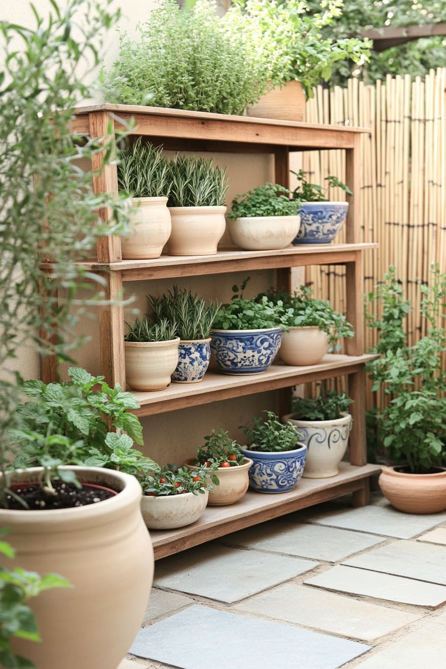 To recreate this inviting atmosphere at home, consider using a tiered wooden shelf to maximize vertical space and display herbs in a variety of pots for added texture. Grouping similar plants like thyme and oregano together will create an organized yet lush look, while ensuring they receive adequate sunlight and moisture will keep them thriving.
