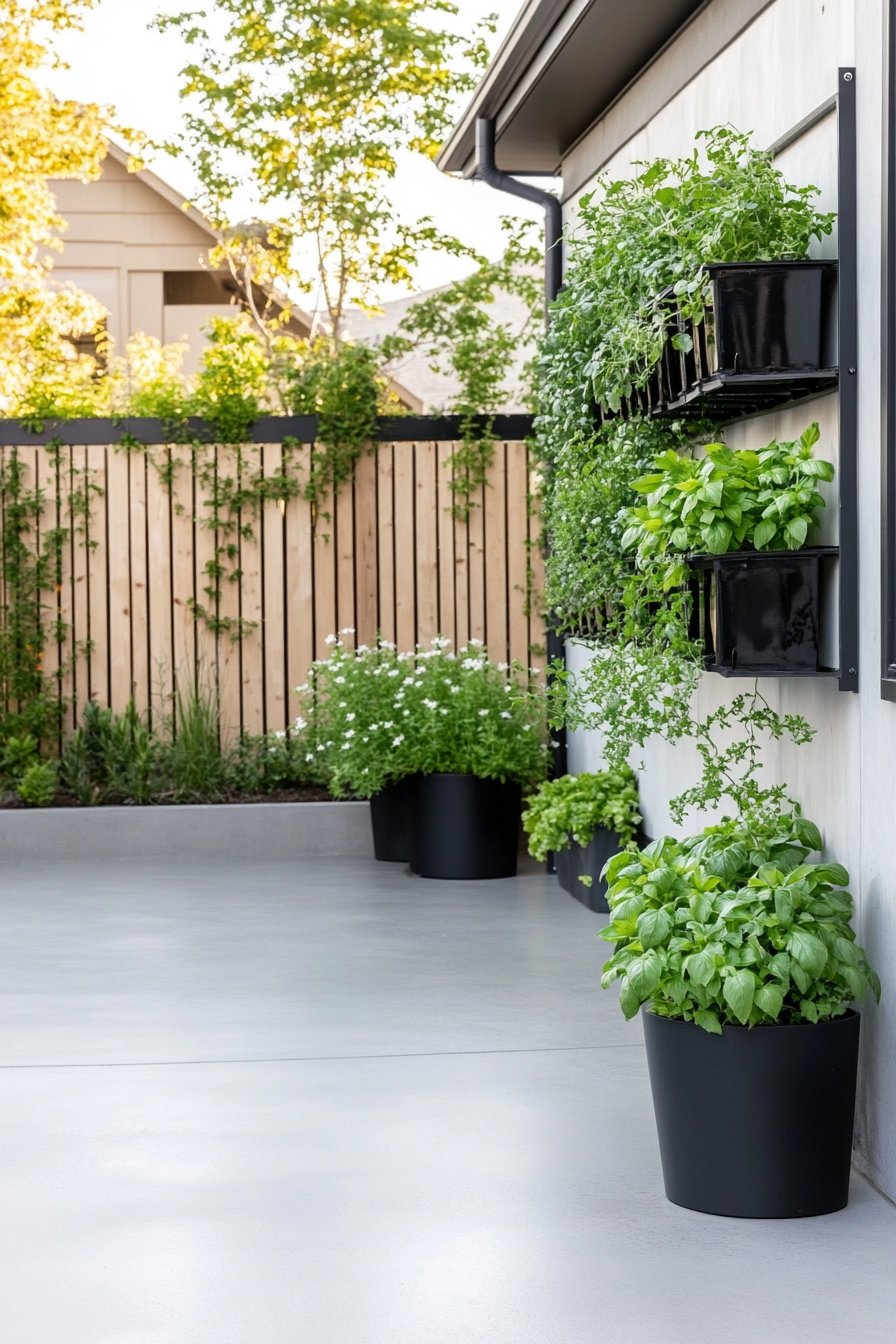 I absolutely adore the sleek, contemporary vibe created by the vertical arrangement of herbs, with vibrant greens like basil, mint, and thyme cascading beautifully against a minimalist backdrop. The glossy black planters provide a stunning contrast, enhancing the lush foliage while maximizing space in any small garden or patio.