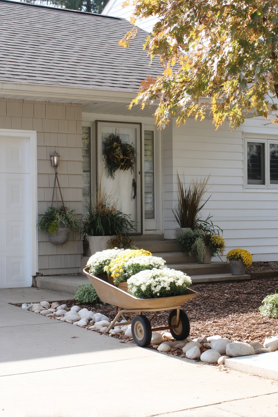 The charming rustic wheelbarrow brimming with vibrant yellow and white mums creates a delightful focal point, enhancing the welcoming atmosphere of the entryway. To replicate this look, consider using seasonal blooms in vintage containers and adding varied heights with ornamental grasses for visual interest.