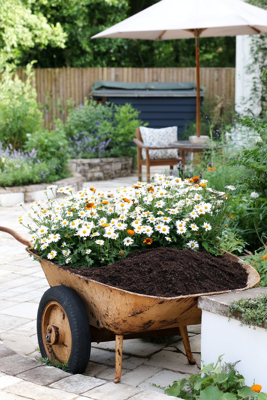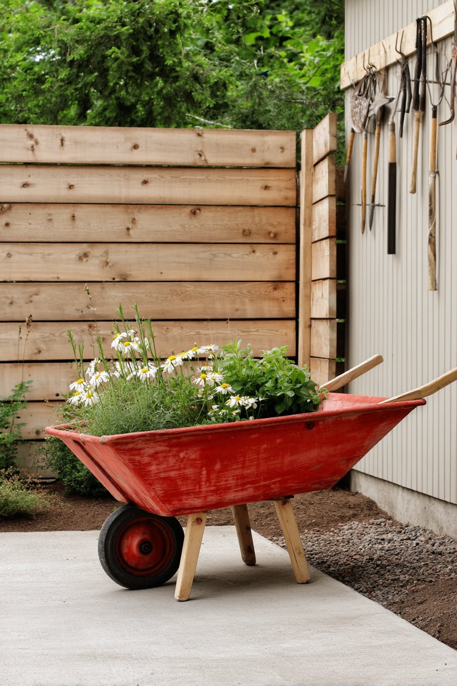 A charming rustic touch is created with a vibrant red wheelbarrow overflowing with cheerful daisies and lush greenery, perfect for adding character to any garden. For a similar effect, combine bright blooms with fragrant herbs in vintage containers to enhance your outdoor space.
