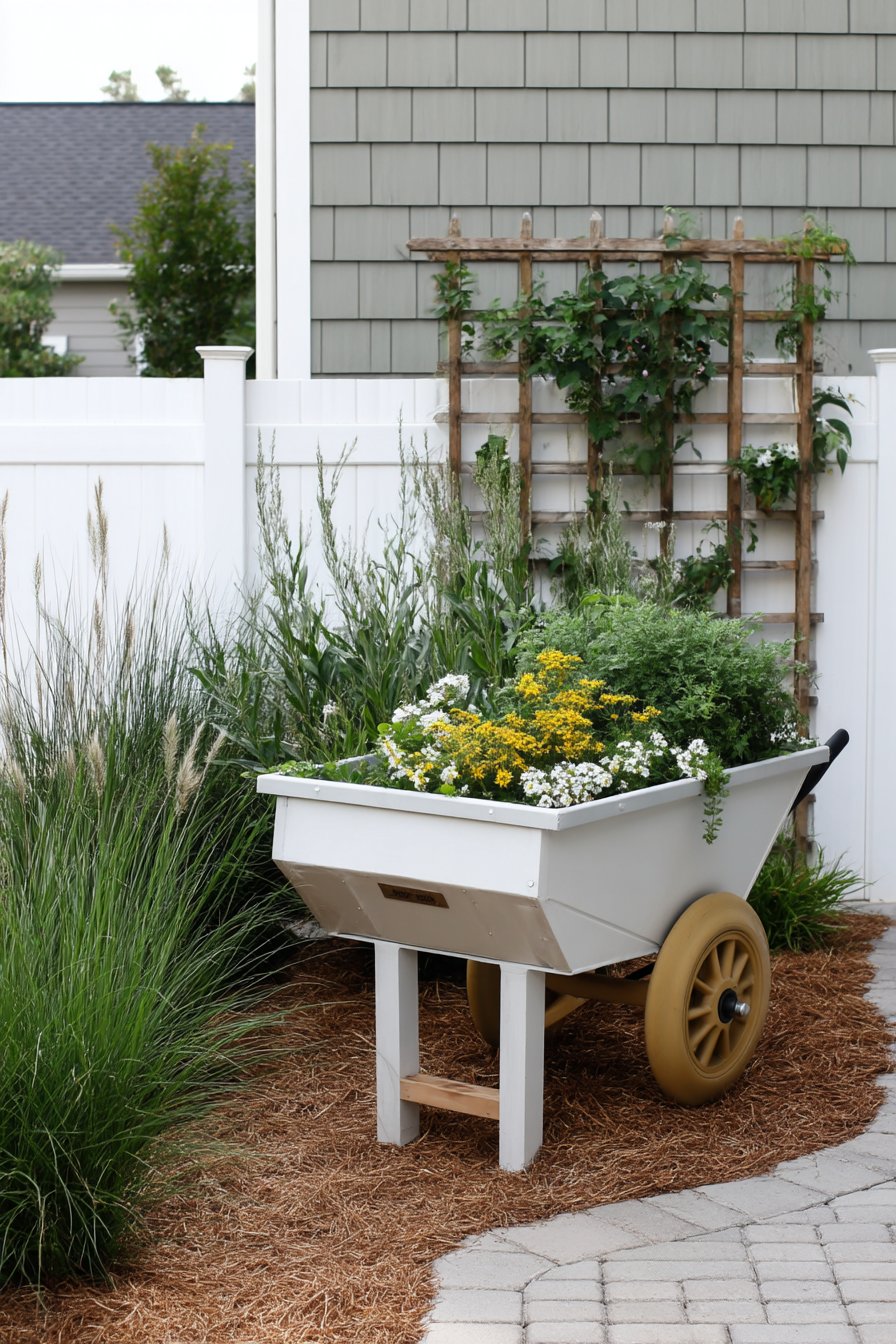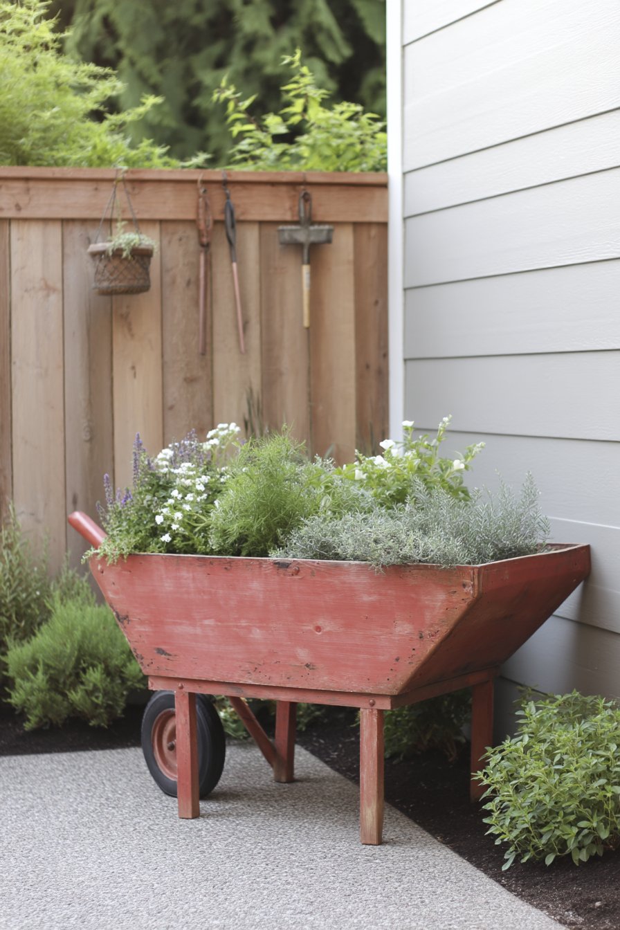 Incorporating a rustic wheelbarrow filled with fragrant herbs like rosemary and thyme alongside delicate white flowers creates a charming focal point for any garden. To replicate this look, choose vibrant containers and mix both edible and ornamental plants for visual appeal and practicality.