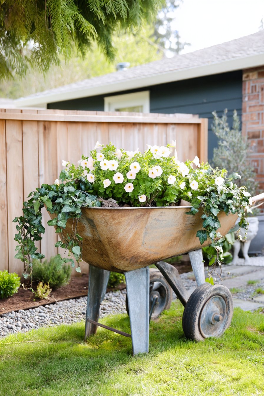 A rustic wheelbarrow overflowing with soft white petunias and cascading ivy creates a charming focal point that enhances any garden space. To replicate this look, choose a vintage container and combine vibrant blooms with trailing greenery for added texture and depth.