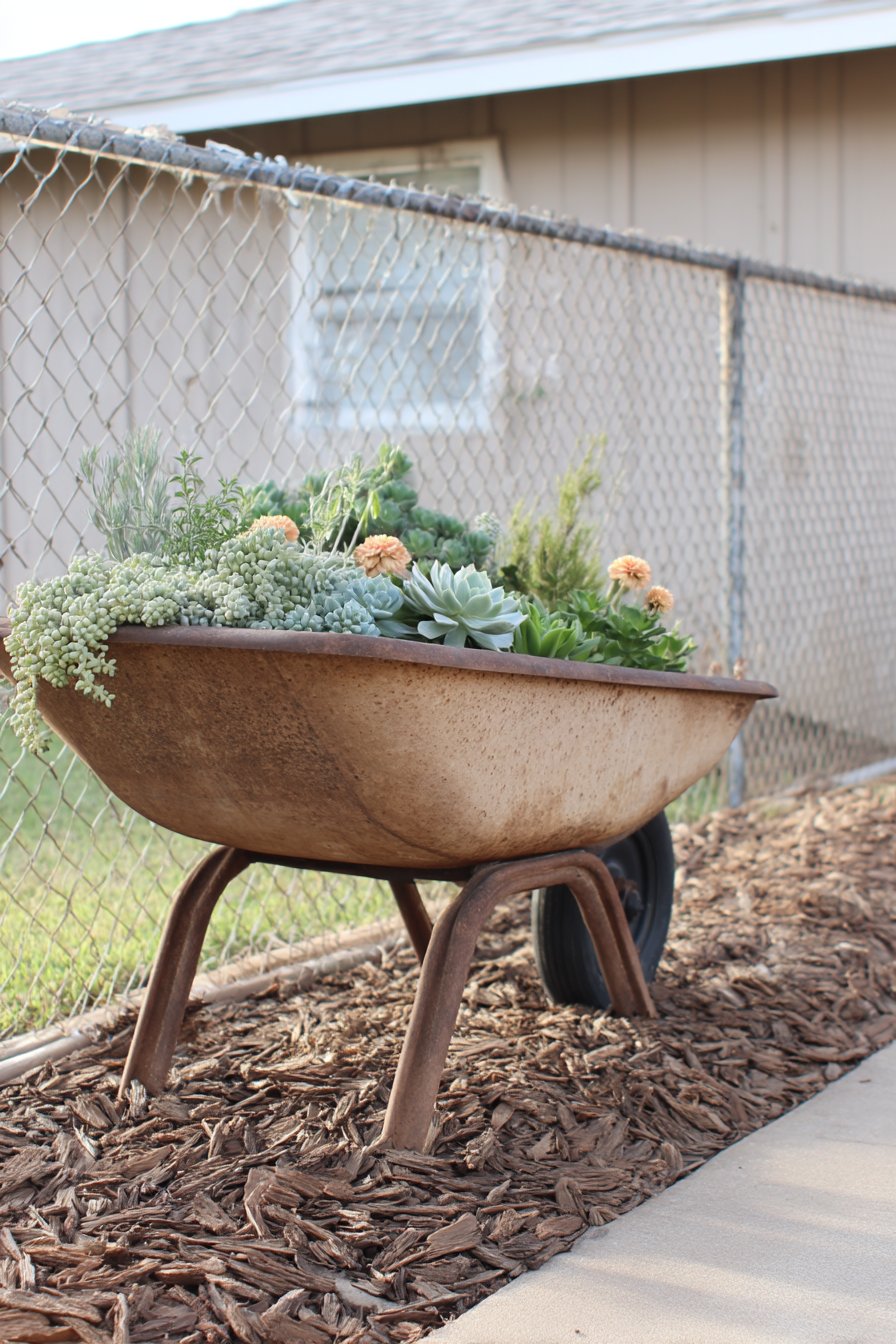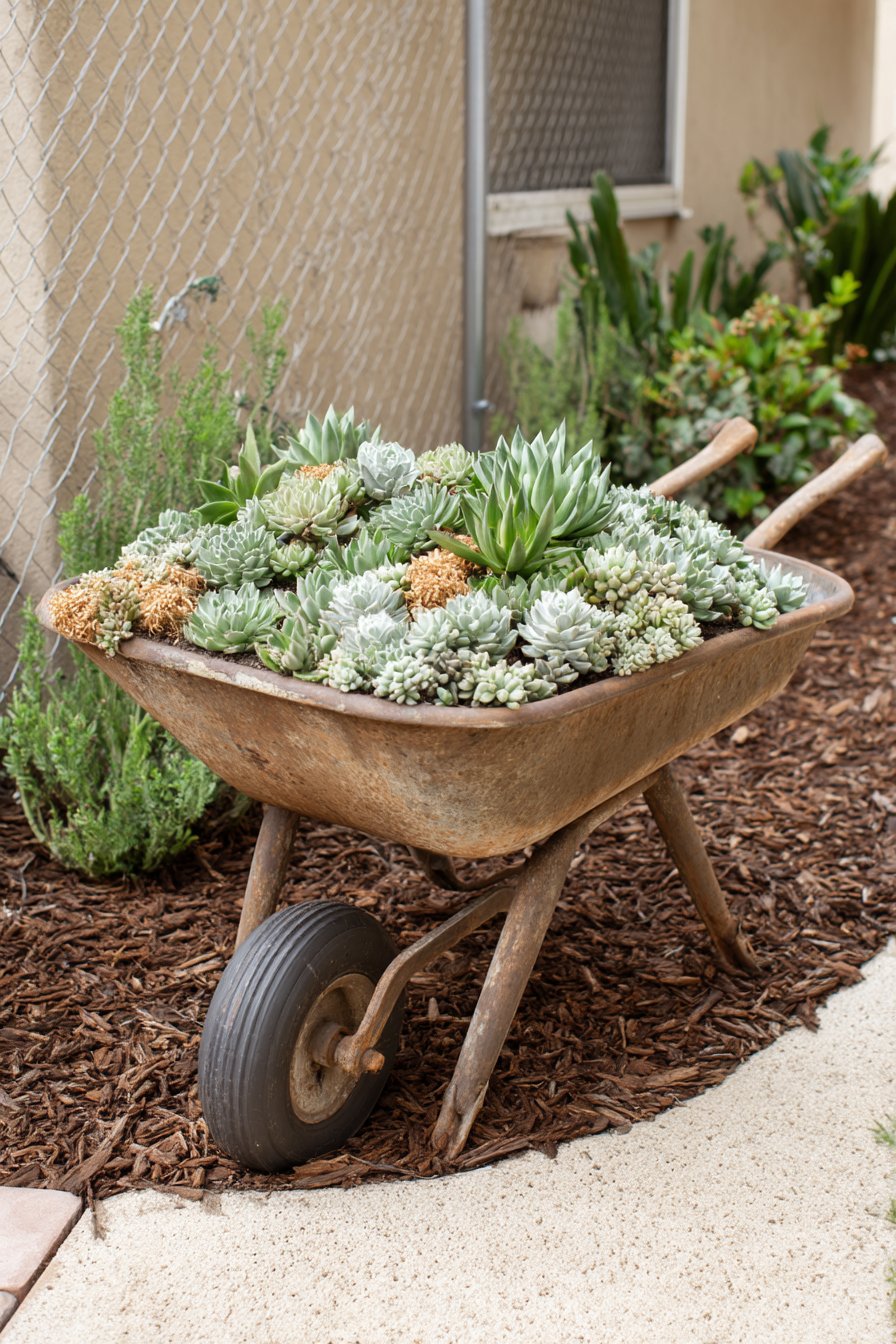 A rustic wheelbarrow brimming with vibrant succulents creates a charming focal point, showcasing various textures and shades of green alongside pops of earthy tones. To replicate this look, choose drought-tolerant succulents like Echeveria and Sedum, and ensure proper drainage by using a well-draining soil mix.