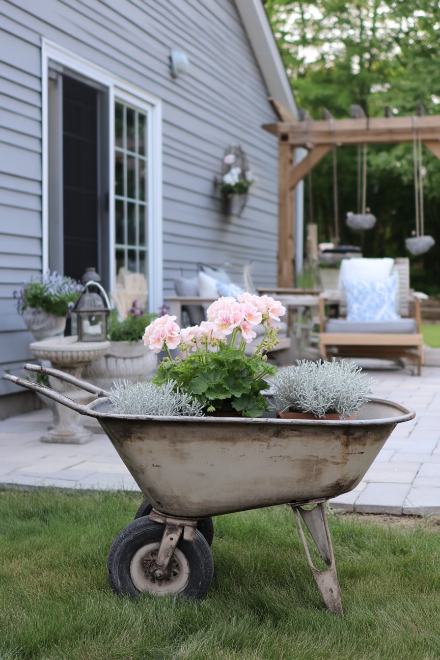 A vintage wheelbarrow filled with soft pink geraniums and silver foliage creates a charming focal point that invites warmth and nostalgia. To replicate this look, combine vibrant flowers with contrasting textures in rustic containers for a delightful garden accent.