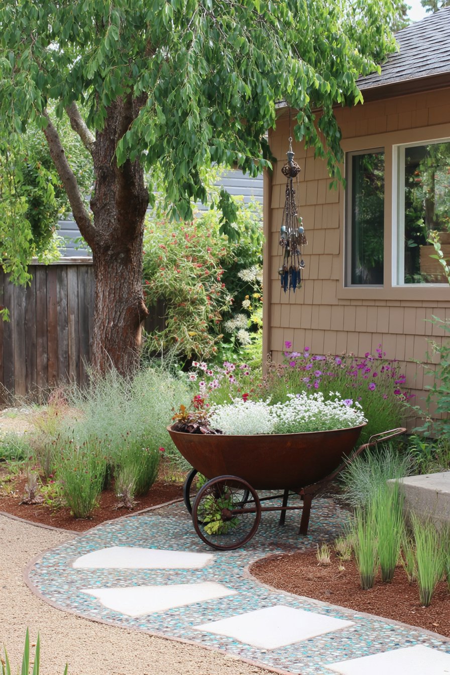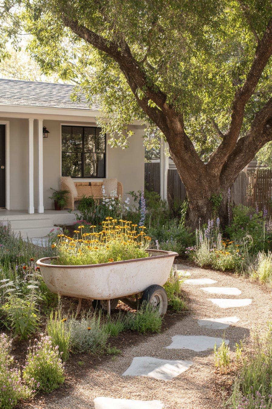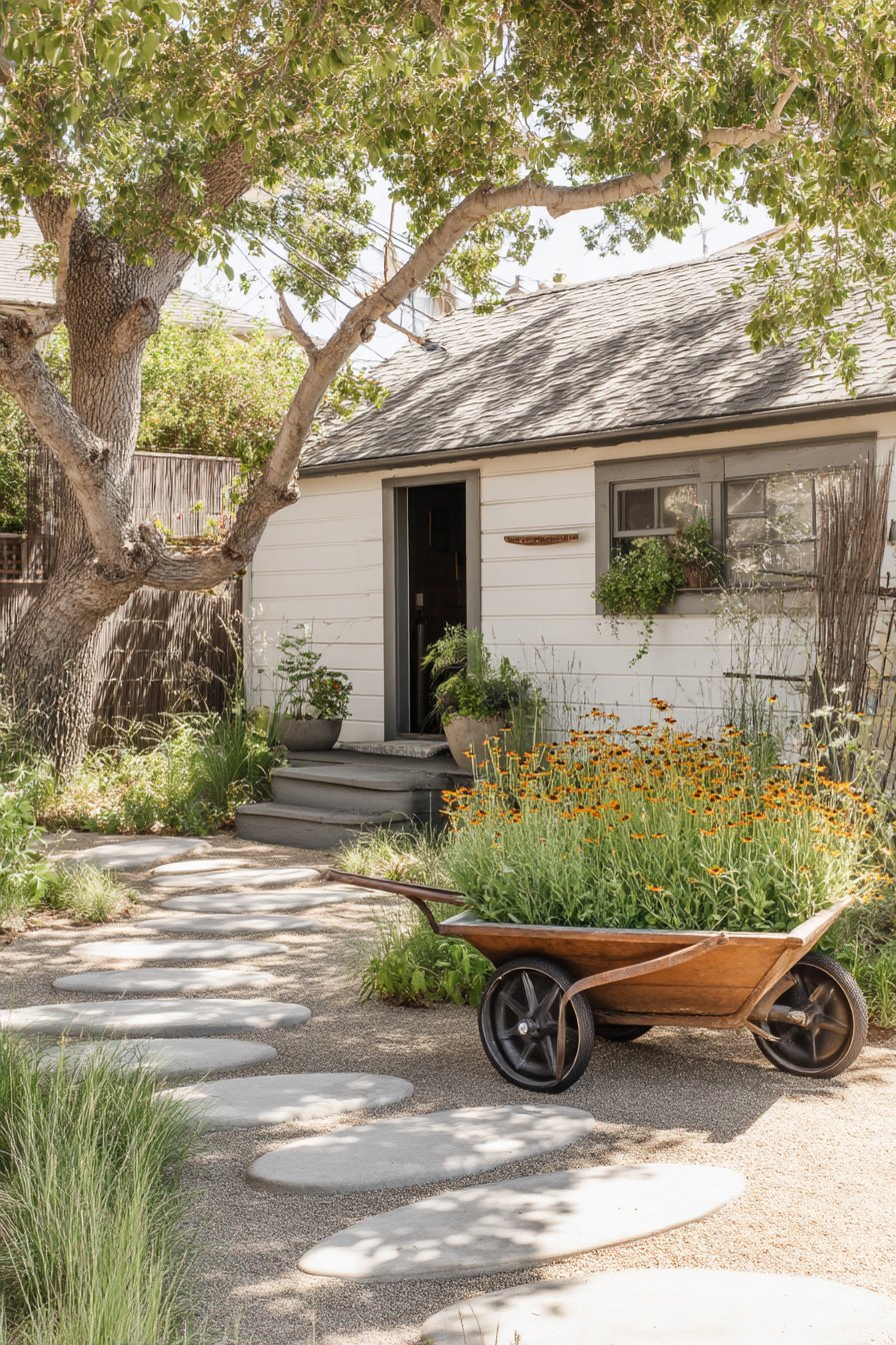 A rustic wheelbarrow overflowing with vibrant marigolds creates a charming focal point, inviting warmth and joy into the garden space. To replicate this inviting look, combine cheerful annuals with native perennials and use natural stone pathways for a seamless, organic feel.