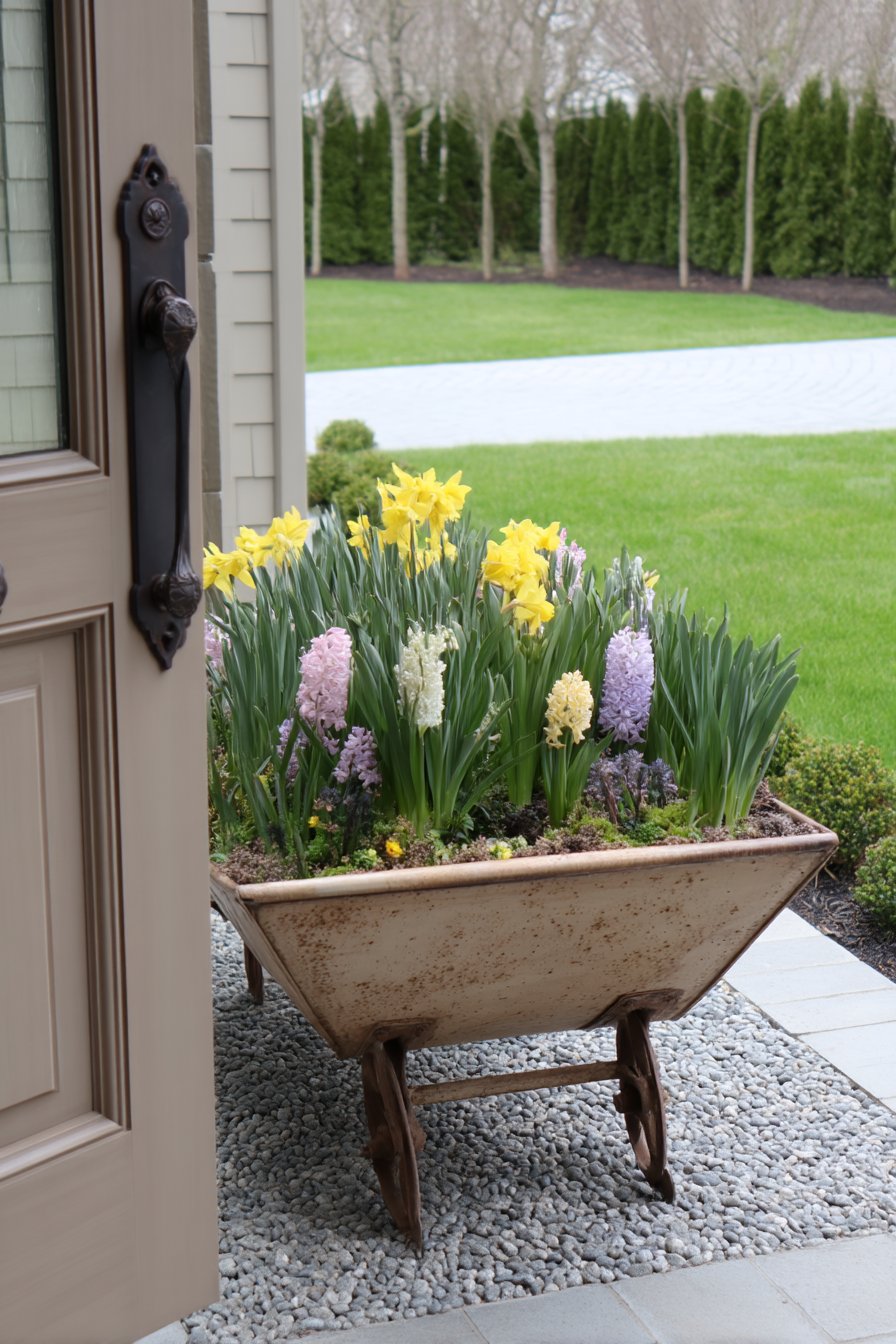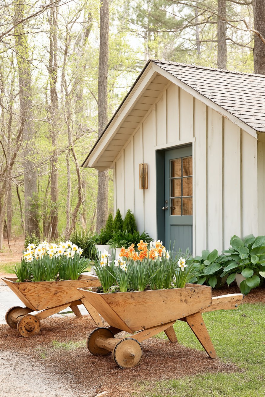 Rustic wheelbarrows filled with vibrant daffodils create a charming focal point, blending functionality with natural beauty. To replicate this look, consider using repurposed items for planters and selecting seasonal blooms for a colorful display.