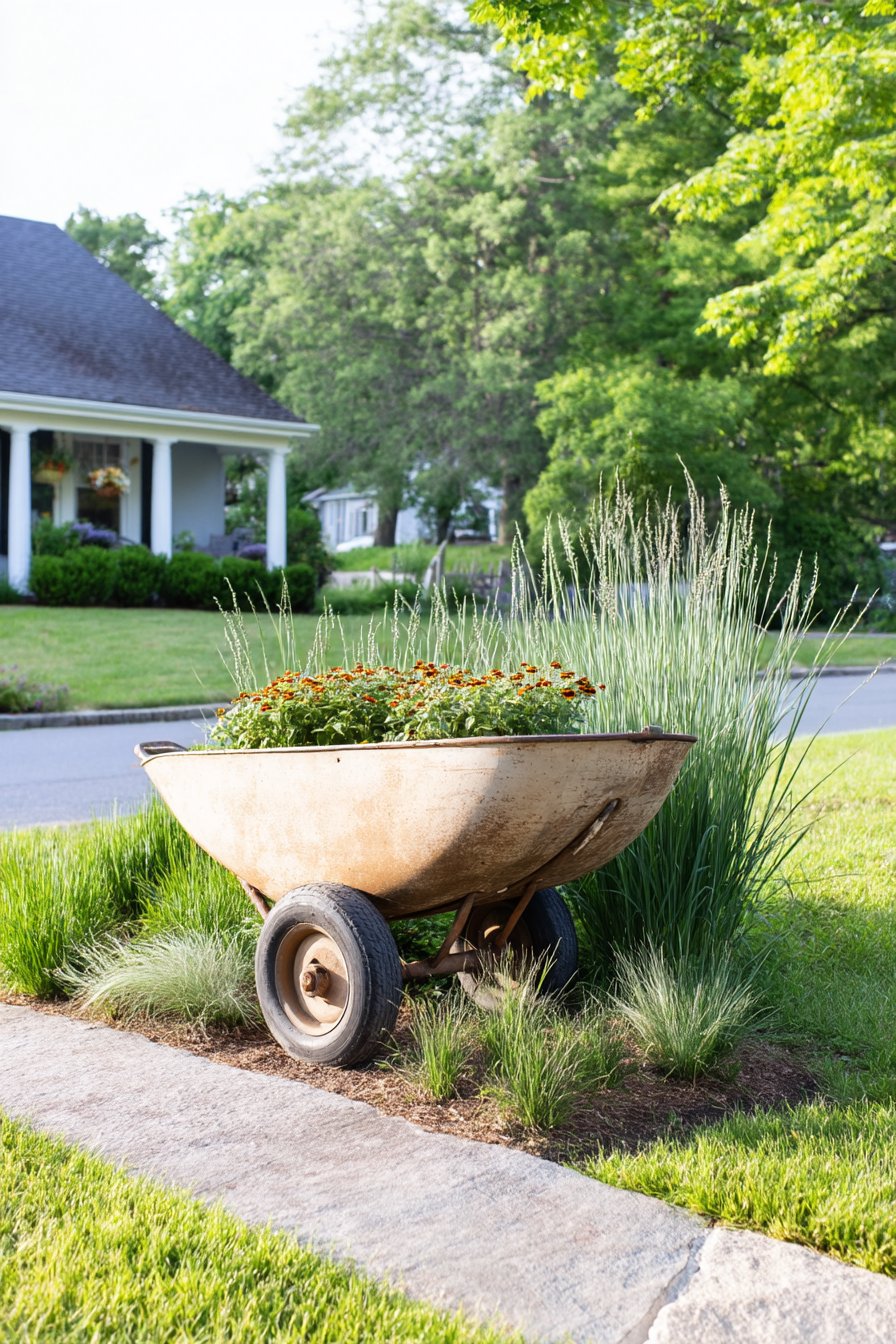 A rustic wheelbarrow brimming with vibrant marigolds adds a charming touch to any garden, creating a focal point that draws the eye. To replicate this look, pair colorful annuals with ornamental grasses for texture, and consider using reclaimed materials for an eco-friendly aesthetic.