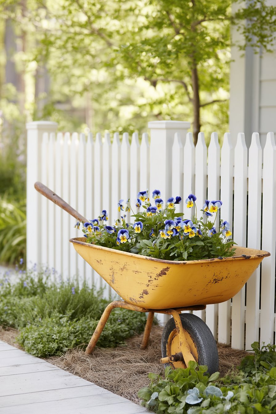 A rustic yellow wheelbarrow brimming with vibrant pansies creates a charming focal point, perfect for adding a pop of color to any garden. Pair with low-growing ground covers and a white picket fence for a cohesive, inviting look.