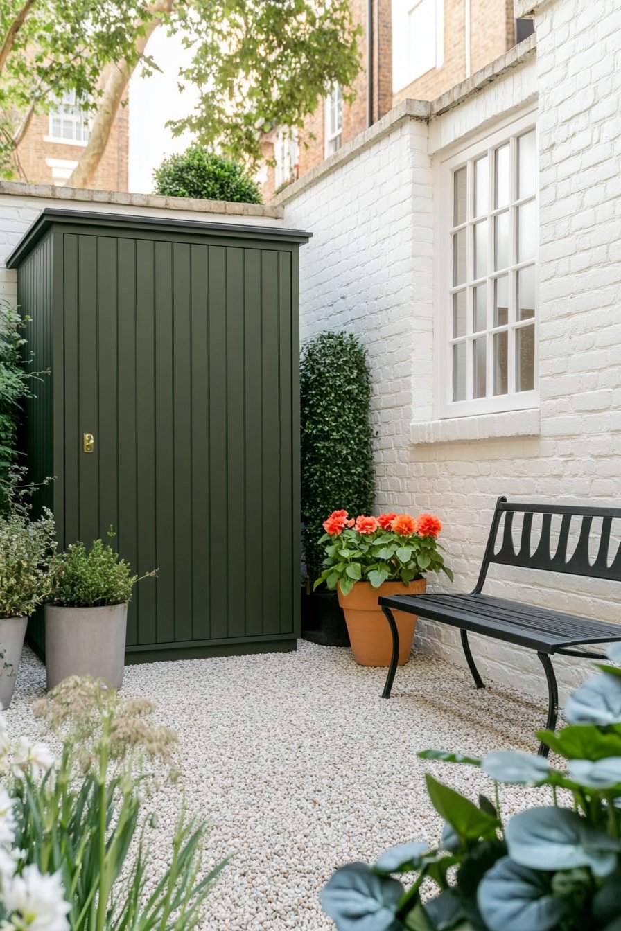 • Blend with the Surroundings: If you want your shed to disappear into the greenery, opt for soft, mossy tones like olive, sage, or lichen. These muted greens echo natural foliage and let the structure melt into the background, especially when paired with climbing plants or surrounding shrubs.