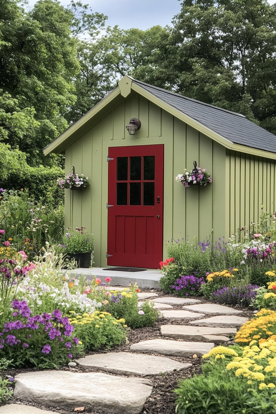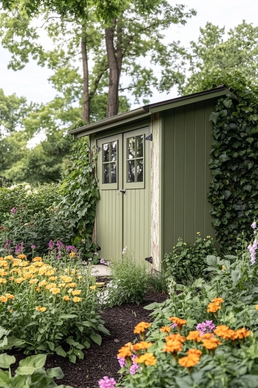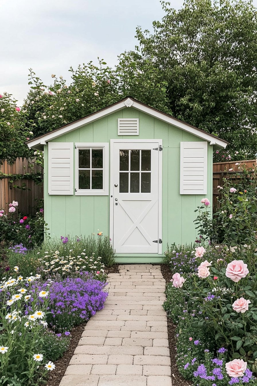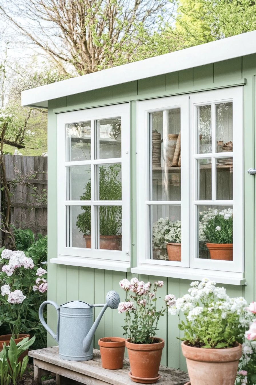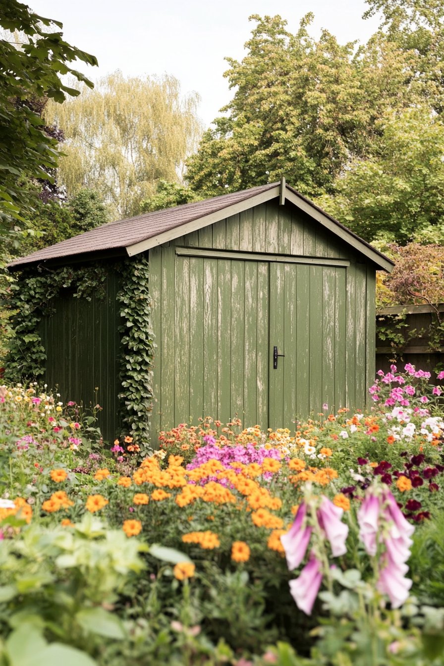 The soft green shed harmonizes beautifully with pastel flowers like geraniums and tulips, creating a serene oasis. To replicate this charm, use terracotta pots for a rustic touch and select a mix of flowering plants for seasonal color.