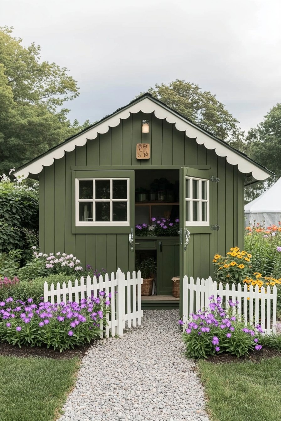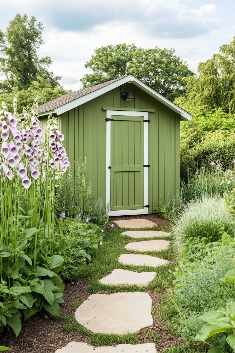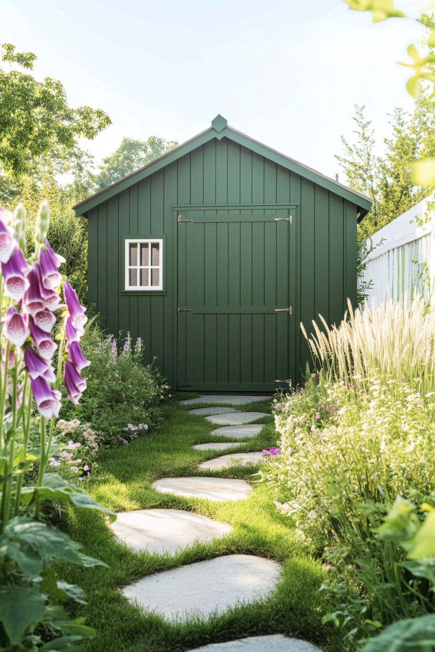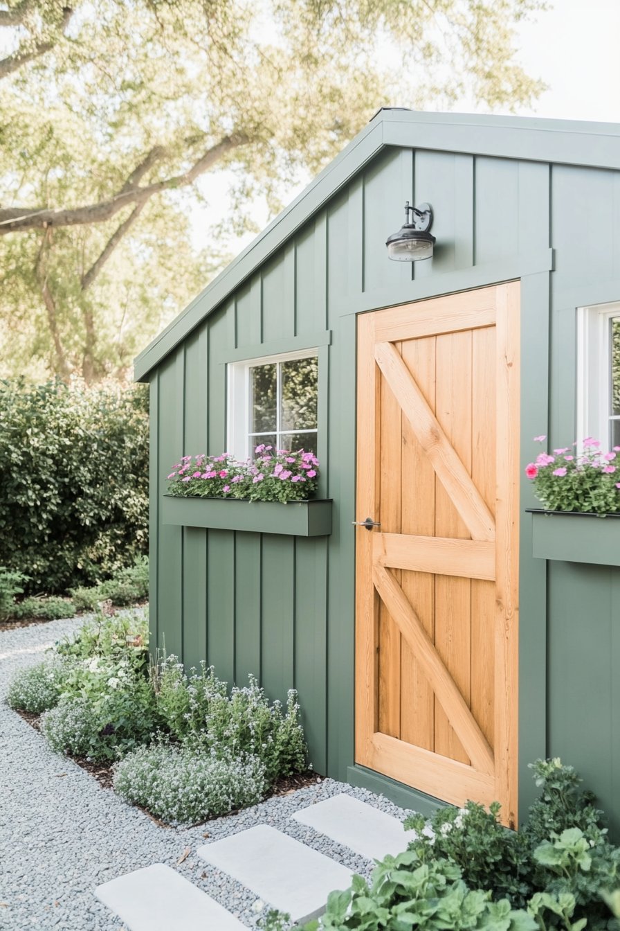 • Coordinate with Accents: Look at your trims, doors, or nearby furniture. Do you want contrast or cohesion? A dusky green shed with black hardware can feel timeless and elegant, while pairing sage green with white or cream trims keeps things light and traditional.
