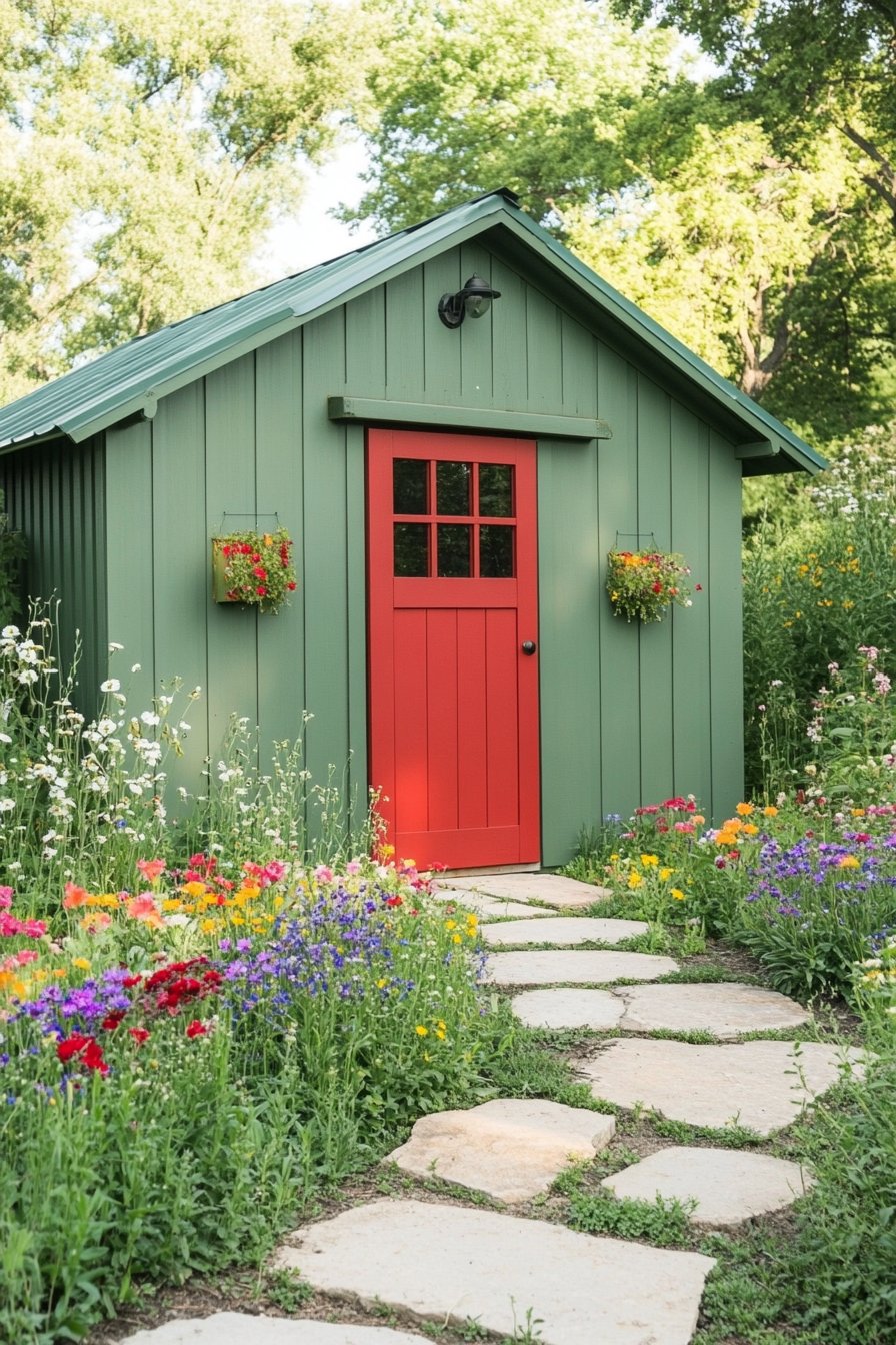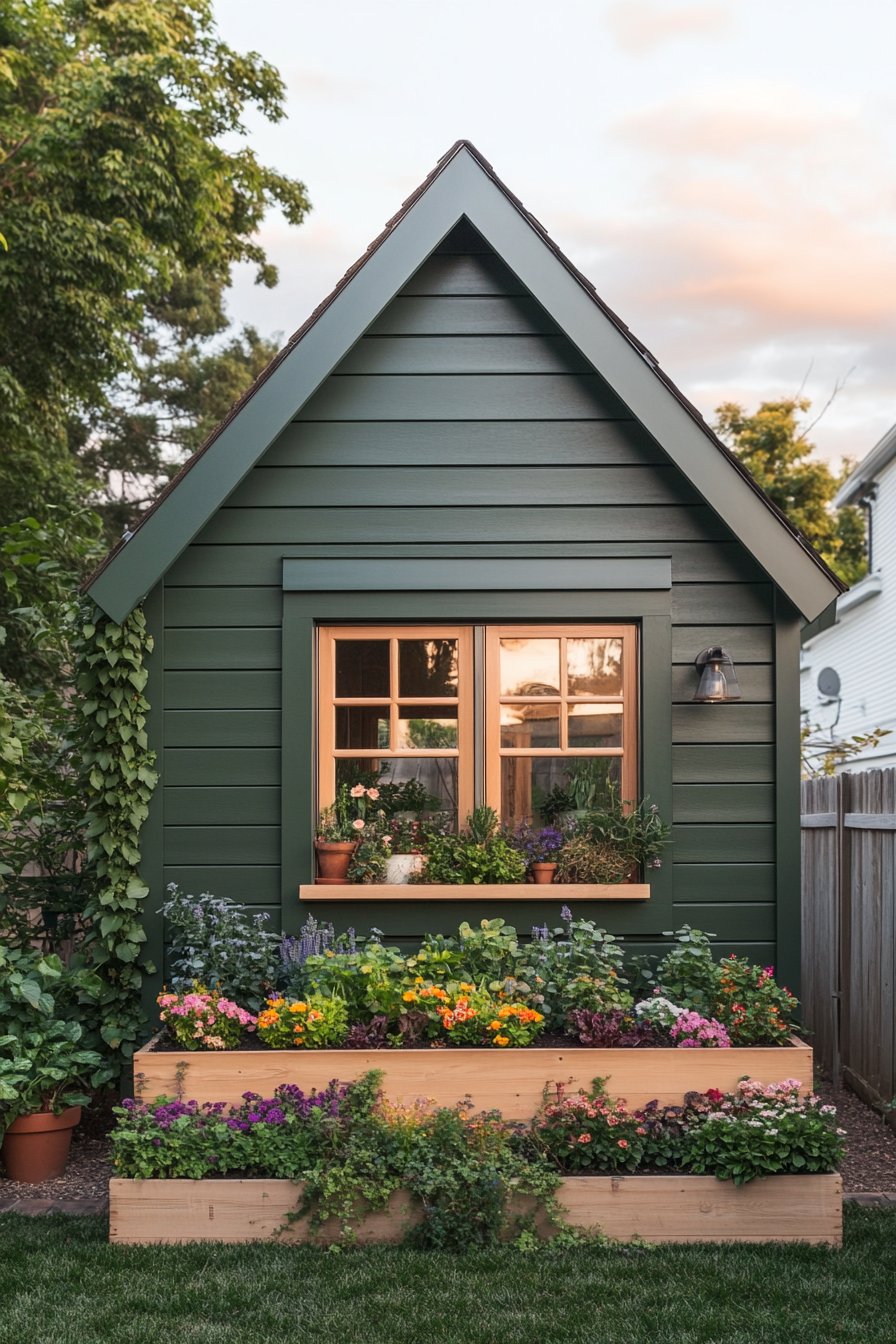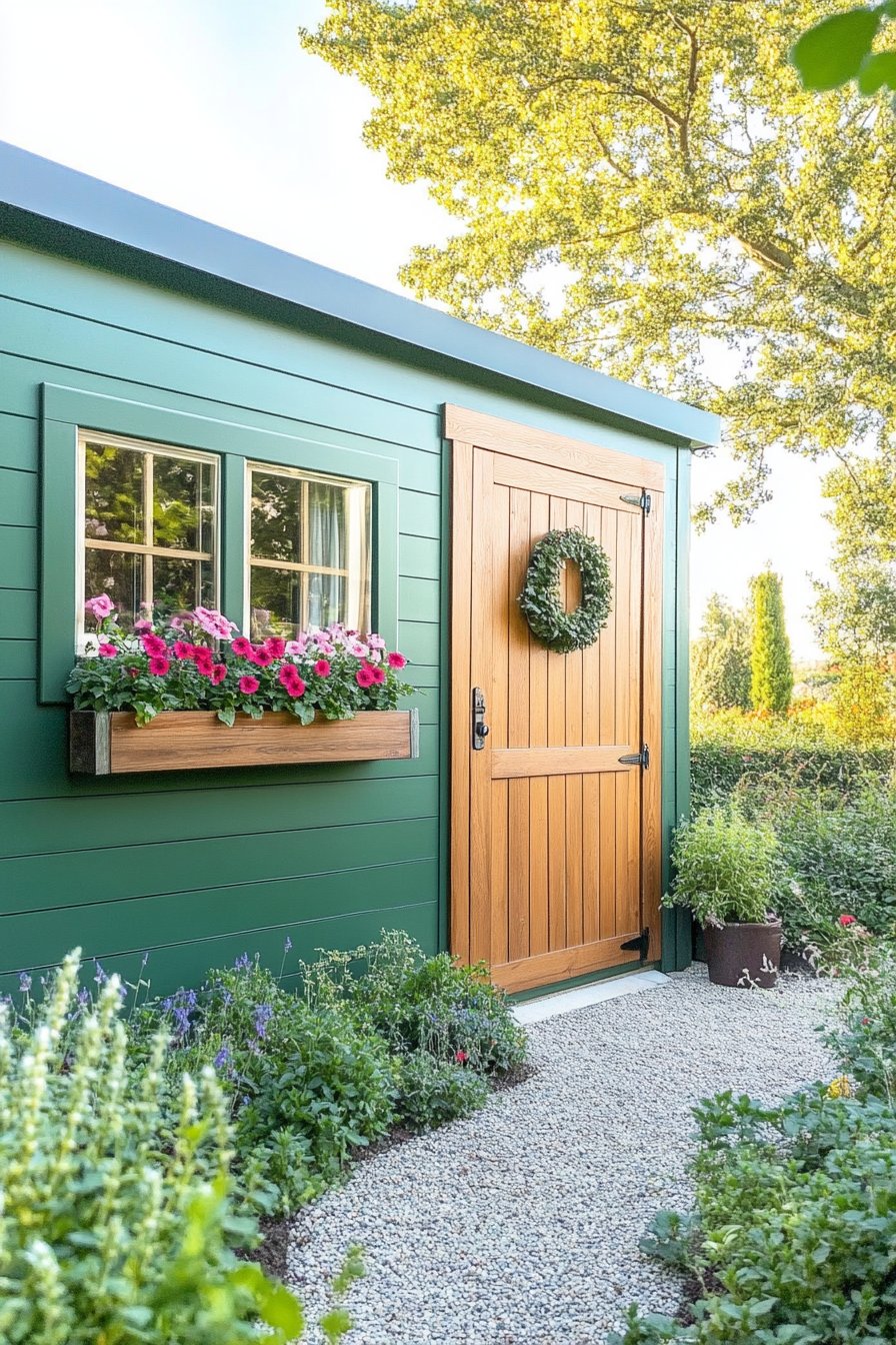 The vibrant petunias in window boxes add a cheerful touch to the rustic shed, beautifully contrasting with the deep green exterior. To replicate this look, consider using colorful flowering plants in wooden containers for a charming and inviting garden space.
