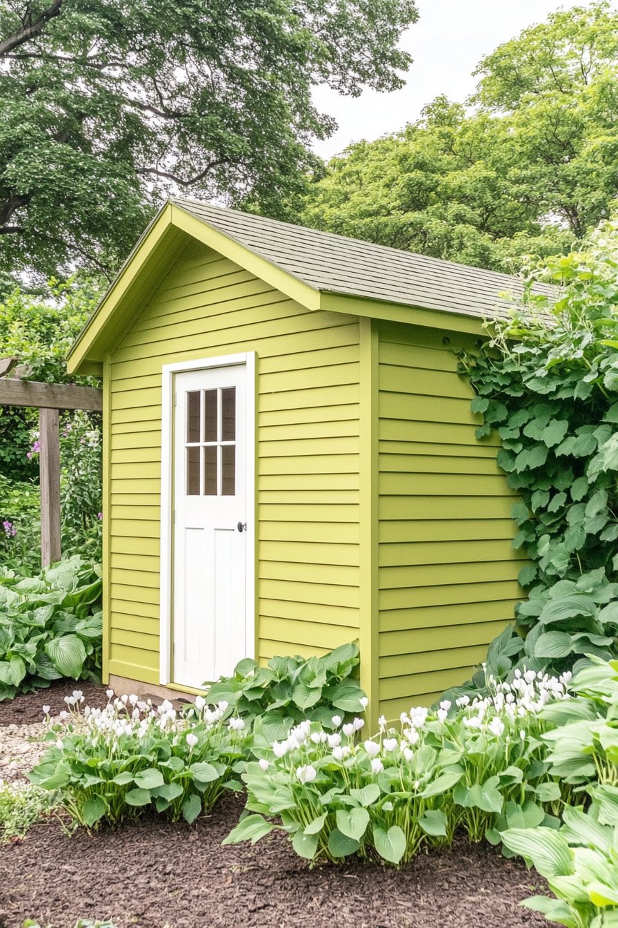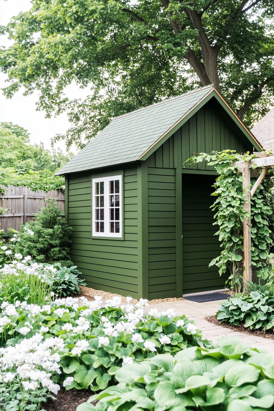 The charming green shed harmonizes beautifully with lush white flowers and vibrant foliage, creating a serene retreat. For a similar effect, plant hostas and white-flowering perennials around a cozy garden structure.
