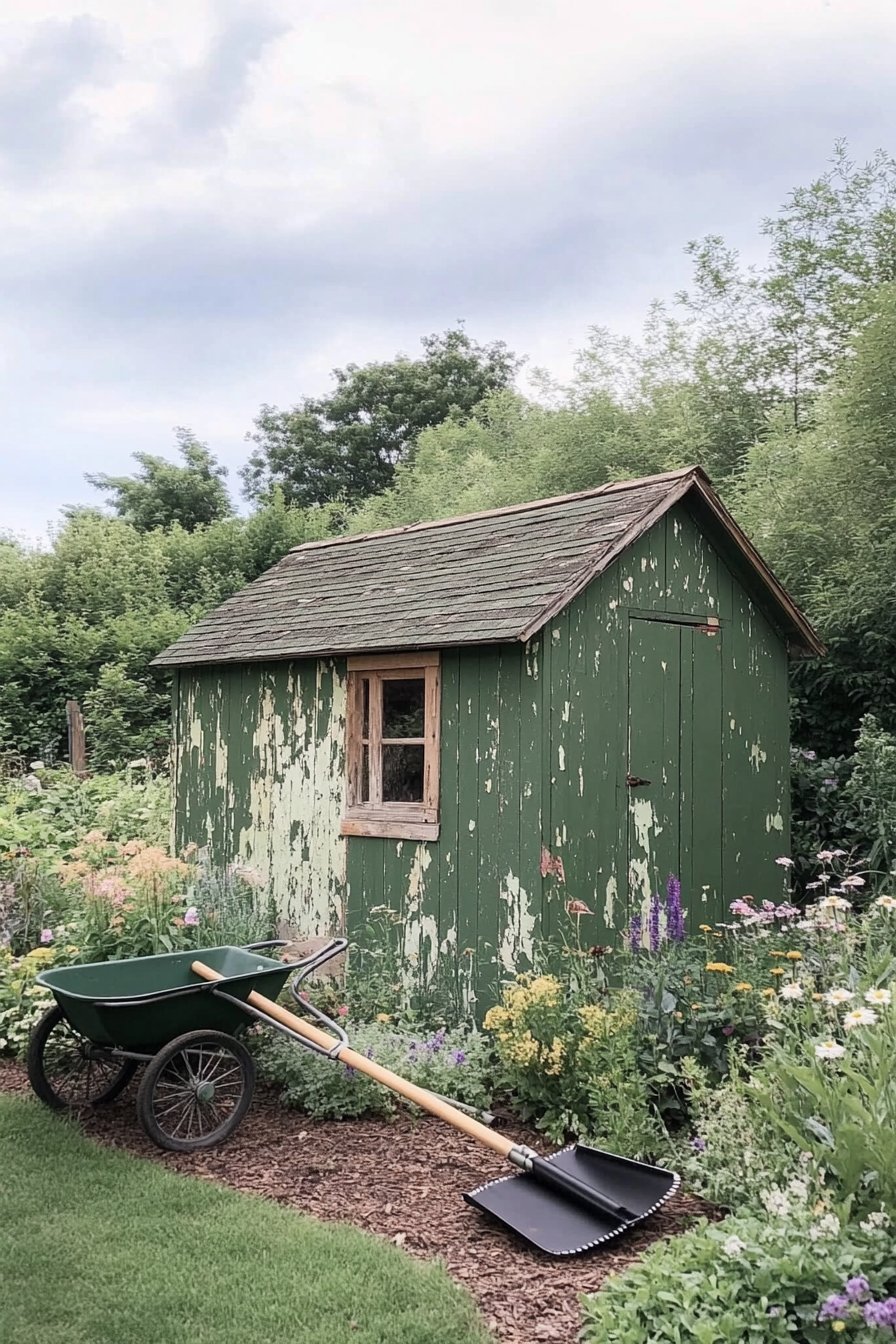 The charming weathered green shed complements a vibrant tapestry of wildflowers like daisies and lupines, creating a delightful rustic ambiance. For a similar effect, incorporate a mix of native wildflowers and a vintage wheelbarrow as a functional garden accent.