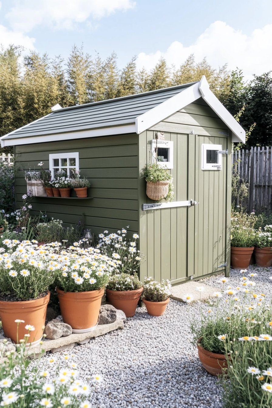 The charming garden features vibrant daisies in terracotta pots, perfectly complementing the rustic green shed and creating a welcoming atmosphere. To replicate this look, combine seasonal flowers with practical containers and incorporate a gravel pathway for easy maintenance.