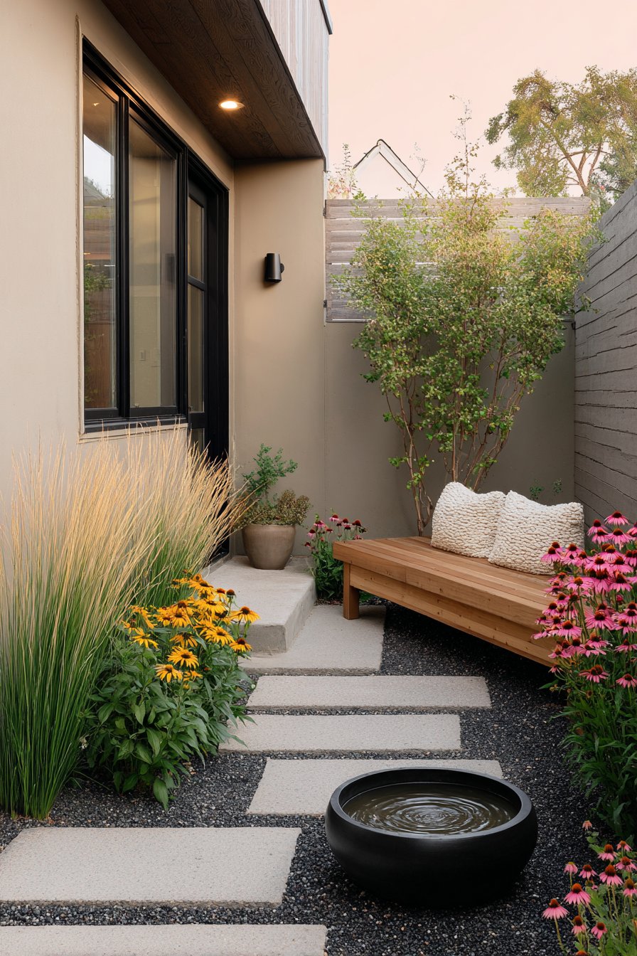 This serene garden features a harmonious blend of soft textures and vibrant colors, creating a tranquil retreat with natural stone paths and a calming water feature. Incorporate tall grasses and lively flowers for visual balance, while using minimalistic furniture to maintain a spacious feel.