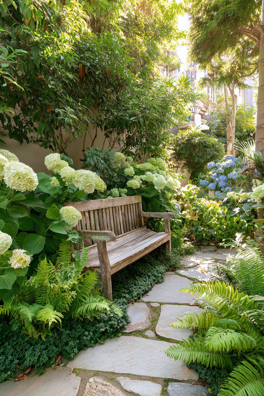 The serene pathway, framed by lush ferns and vibrant hydrangeas, creates a tranquil retreat that invites relaxation and contemplation. To achieve this look, layer different textures and shades of green, and incorporate natural stone for a rustic touch.