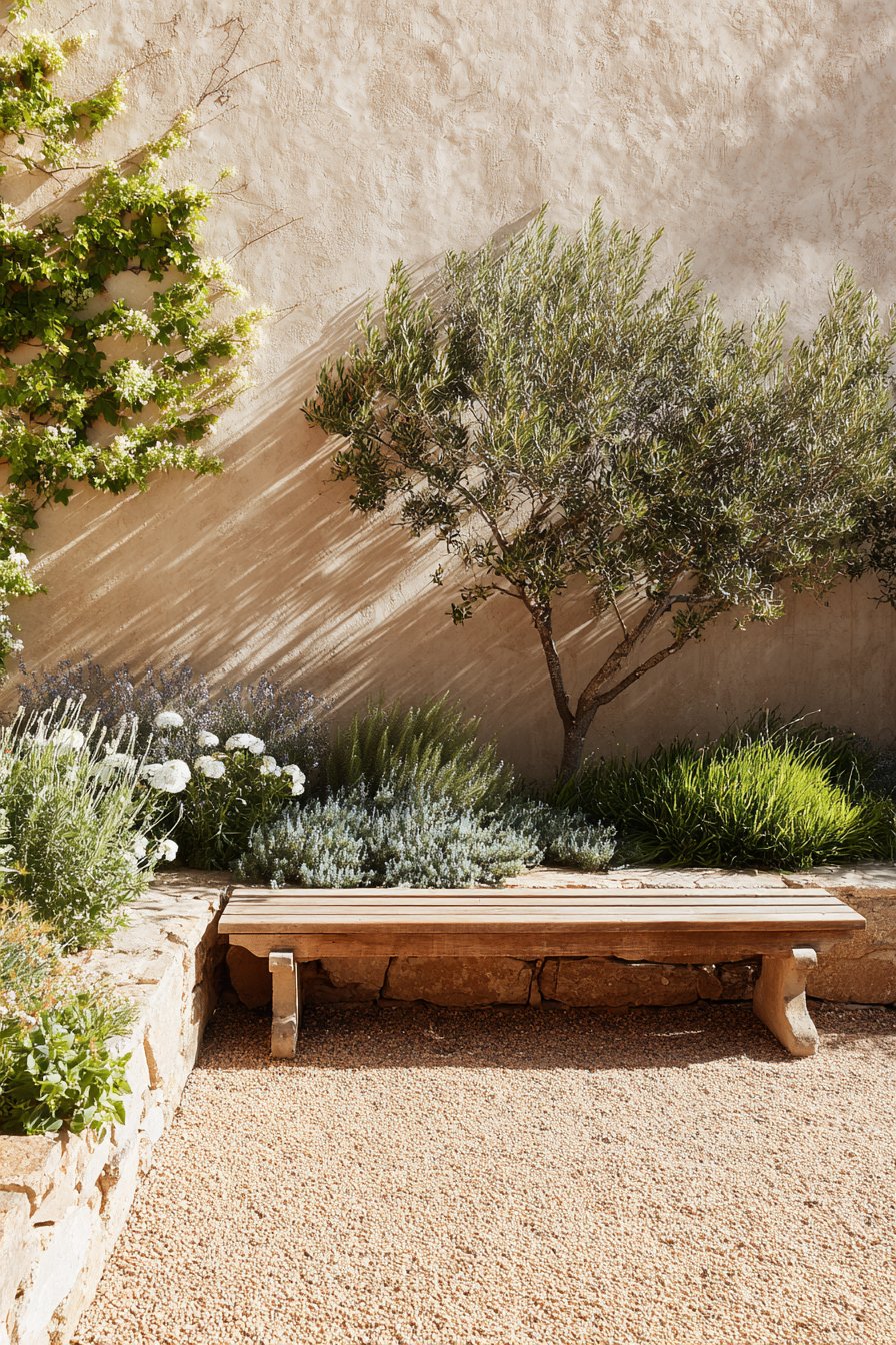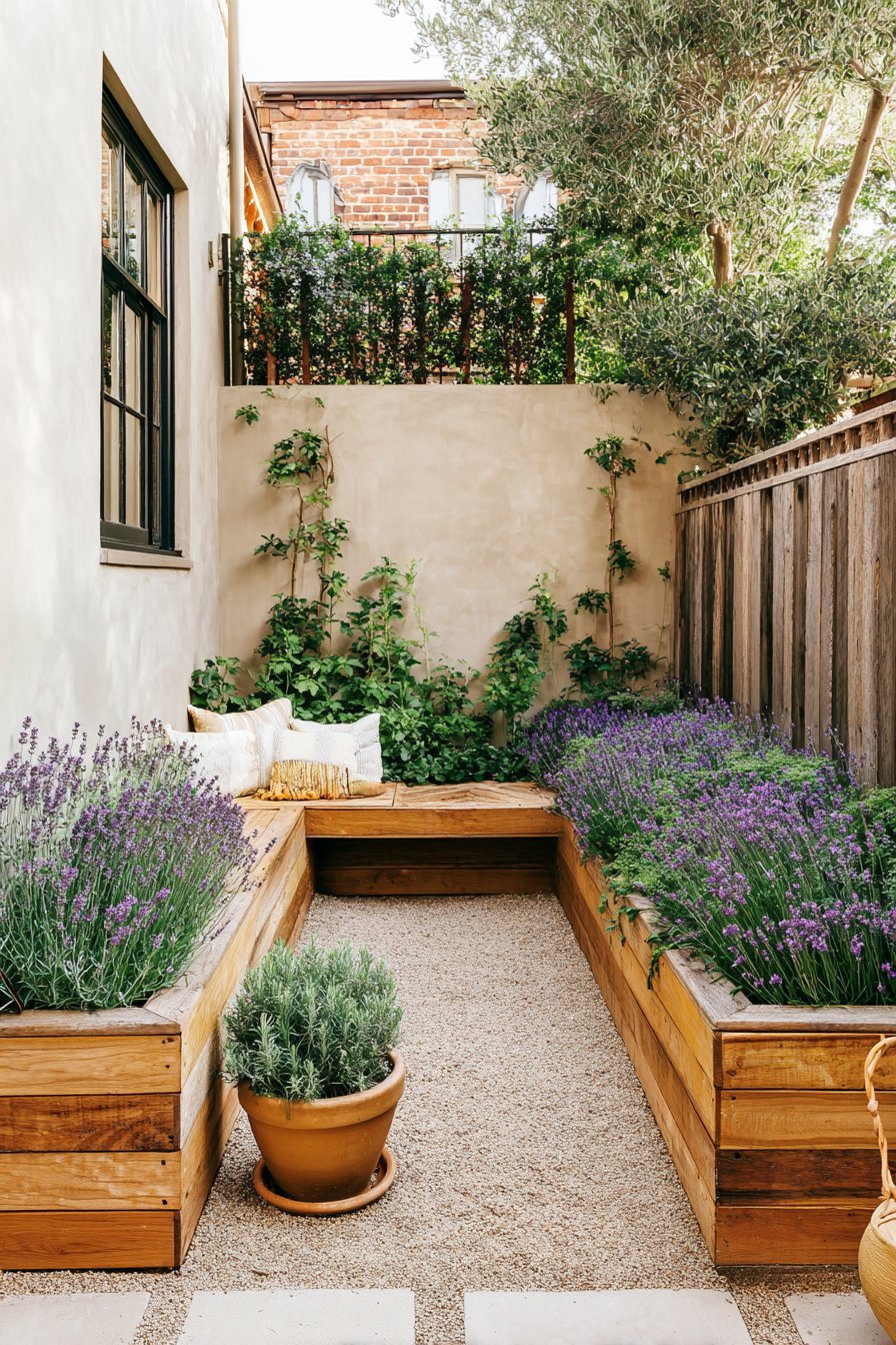 This serene side garden beautifully integrates warm wooden seating with lush lavender, creating a soothing palette that invites relaxation. To replicate this look, combine low-maintenance plants with natural materials and incorporate comfortable seating for a cozy atmosphere.
