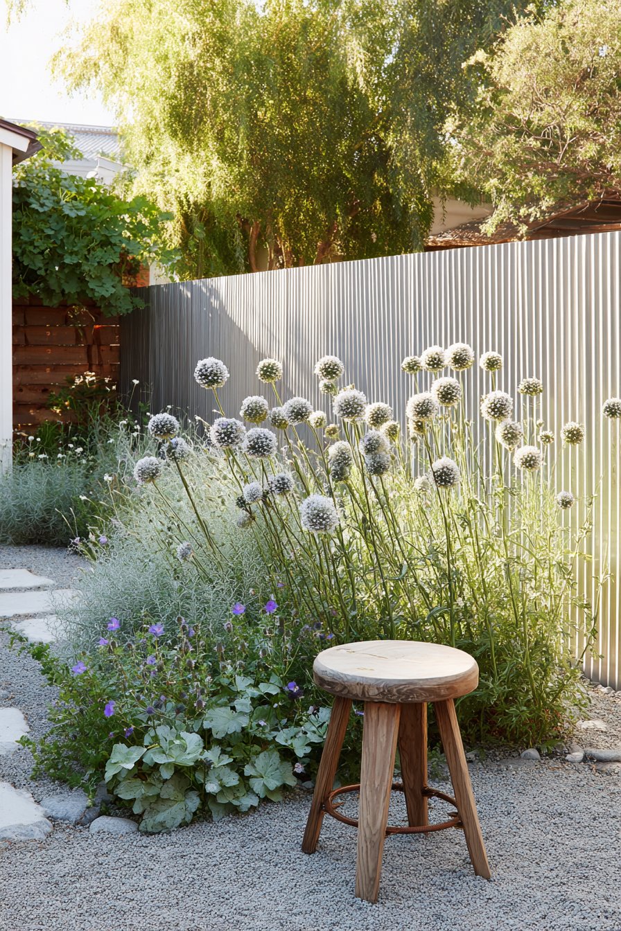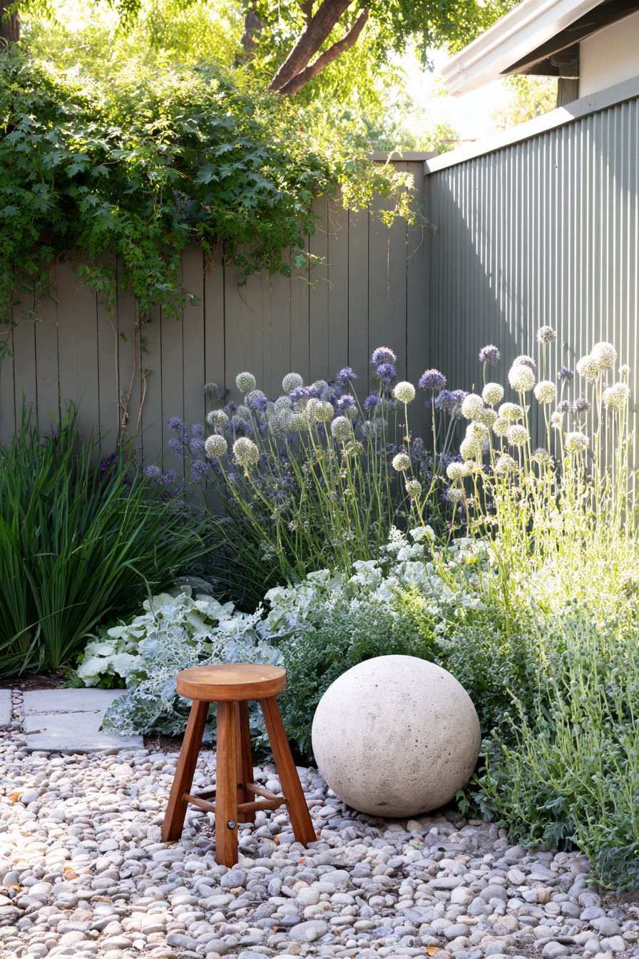 The harmonious blend of alliums and soft, textured foliage creates a serene retreat, while the gravel pathway adds both practicality and aesthetic appeal. Incorporate and gravel to maintain low maintenance and enhance natural beauty in your own garden.