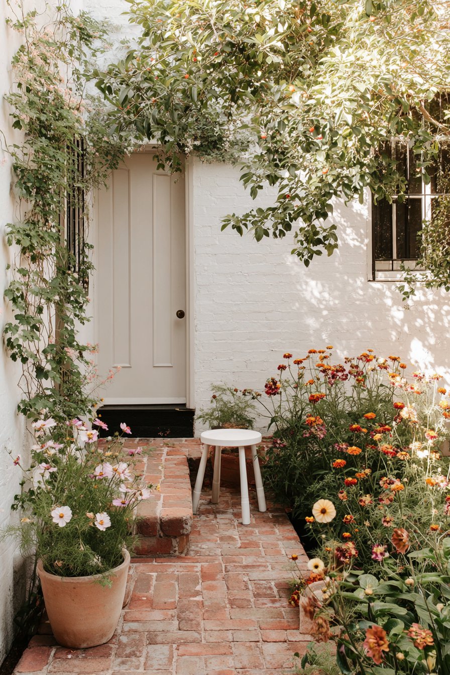 This garden pathway combines warm earth tones with vibrant blooms, creating a welcoming and tranquil atmosphere ideal for relaxation. Incorporate terracotta pots and a mix of perennial and annual flowers to achieve a lush, layered look in your own space.