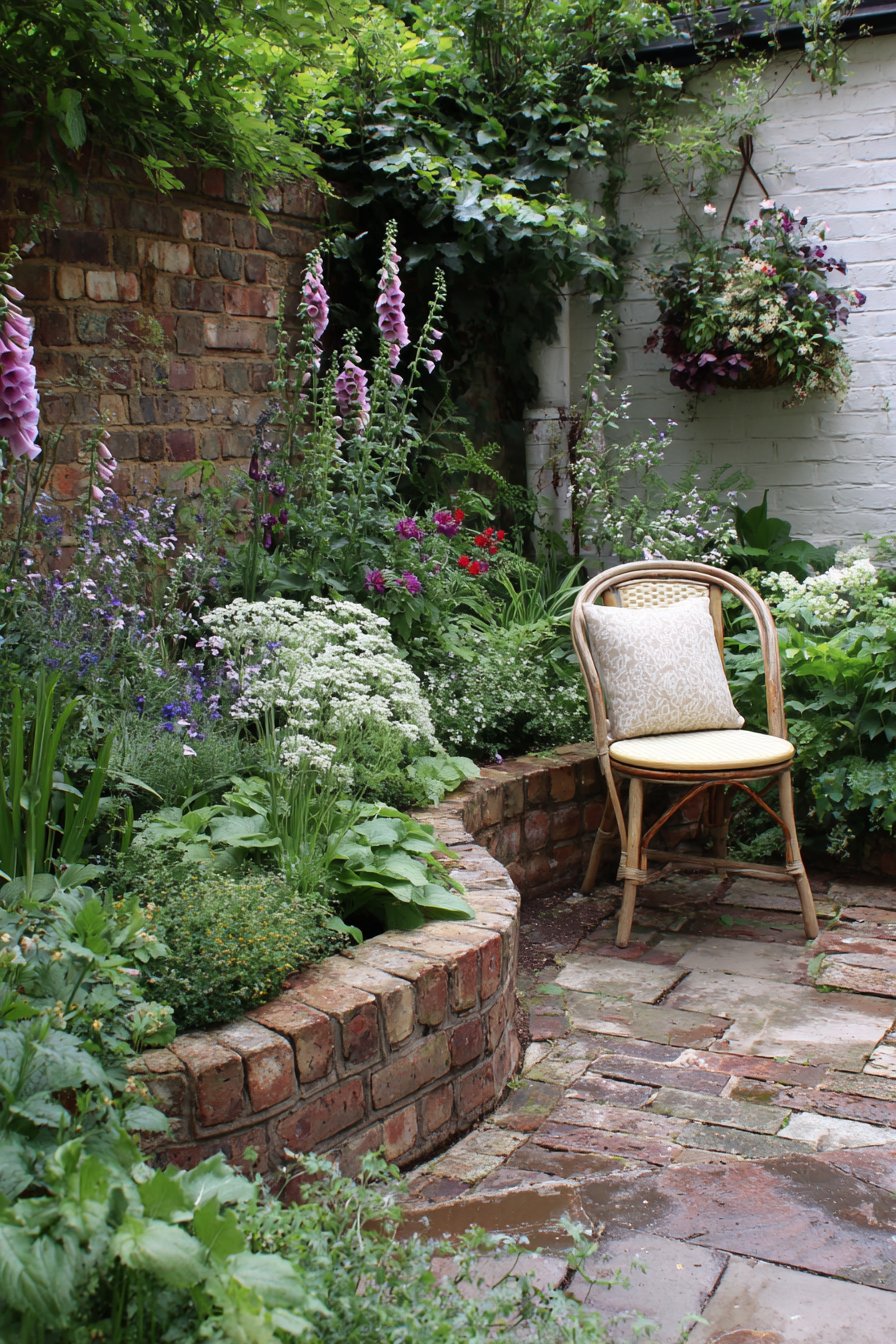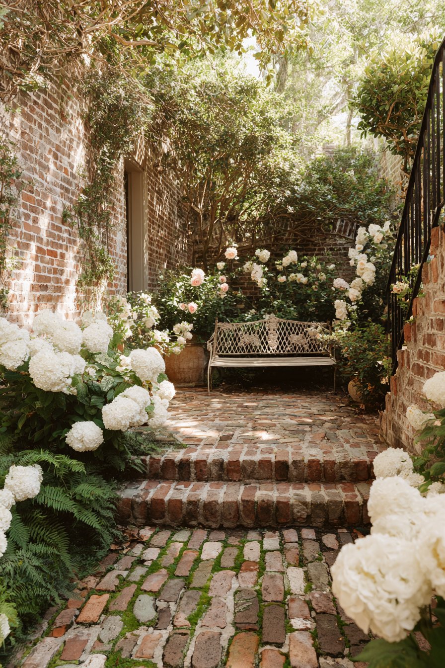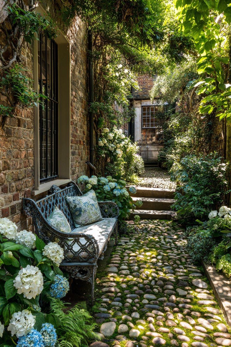 The charming blend of textured brick pathways and lush hydrangeas creates a serene retreat, perfect for relaxation. Incorporate a vintage bench and soft greenery to enhance the inviting atmosphere of your garden space.