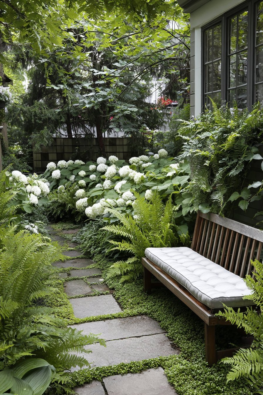 Plants like hydrangeas and ferns work harmoniously, with the white blooms contrasting beautifully against the rich greenery, while ground cover like moss adds softness underfoot.