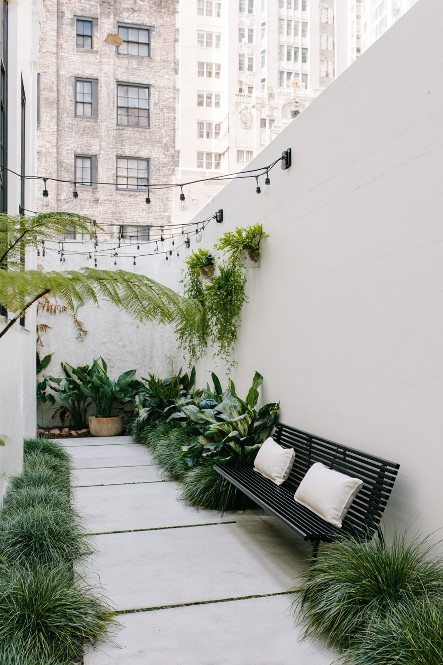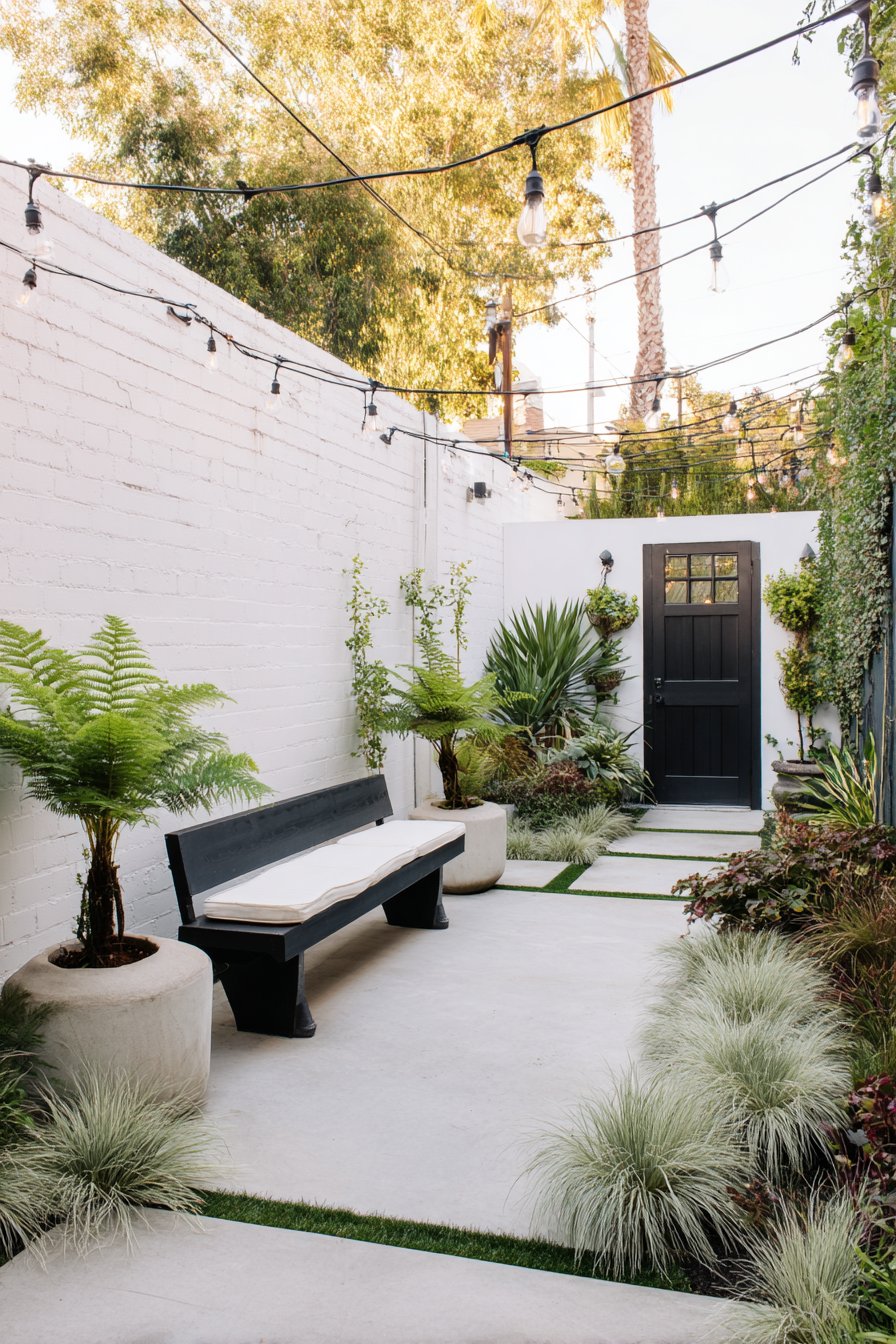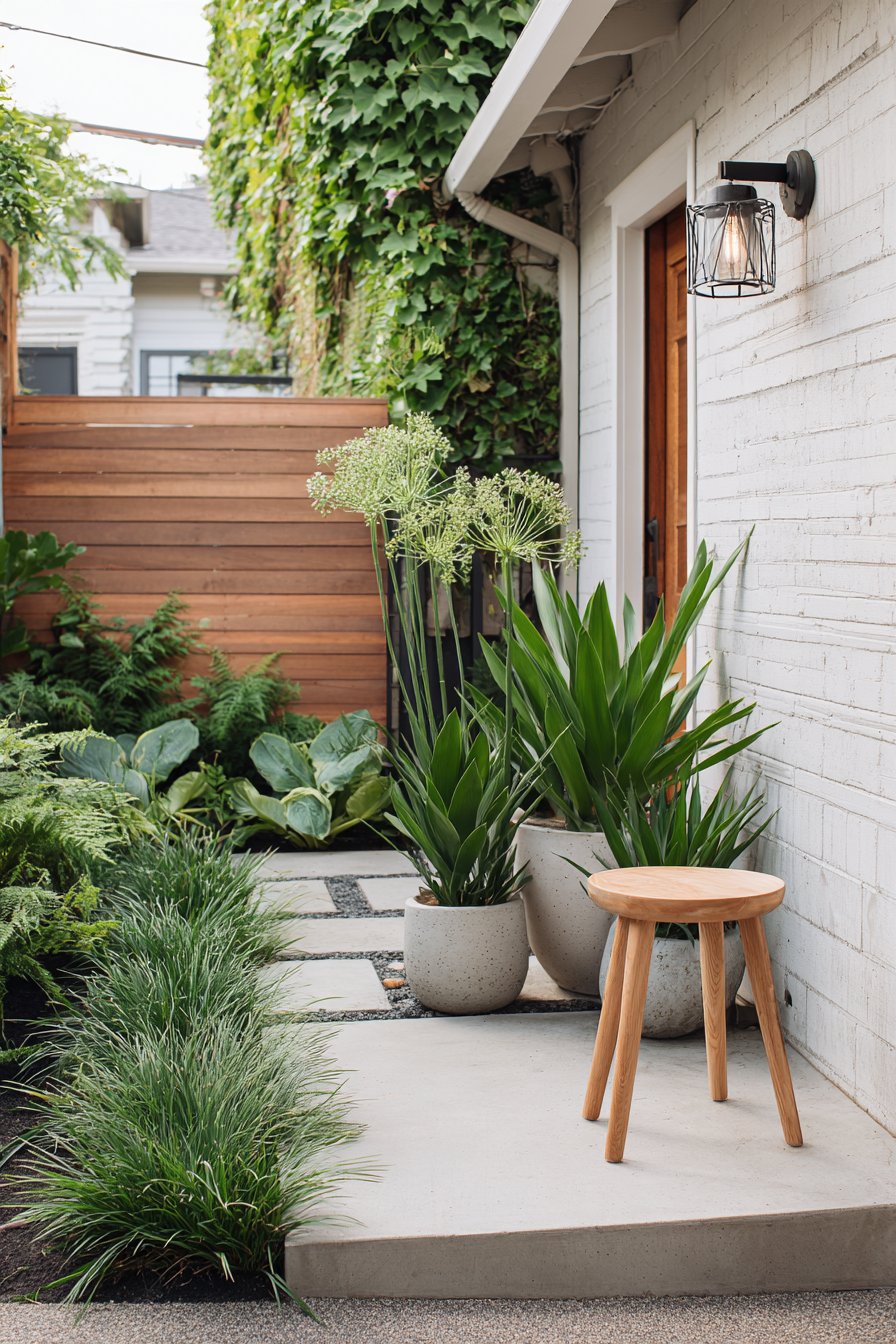 This side garden retreat beautifully combines lush greenery with sleek concrete pathways, creating a serene escape enhanced by soft lighting and comfortable seating. To replicate this look, choose a mix of tropical plants and ornamental grasses, ensuring varied heights and textures for visual interest.