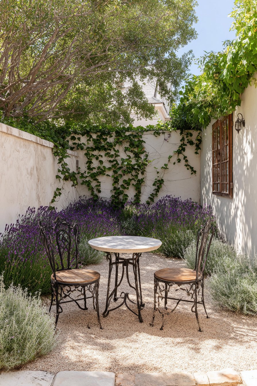 A serene retreat comes alive with rich purple lavender contrasting beautifully against the textured white walls and rustic iron furniture, inviting relaxation. To achieve this aesthetic, incorporate gravel pathways and soft greenery, creating a tranquil oasis in your own garden.