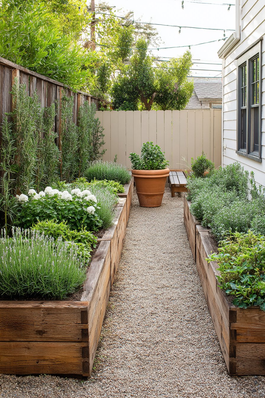 This garden features rustic wooden raised beds filled with a lush assortment of herbs, creating a vibrant tapestry of greens and soft whites. To replicate this look, incorporate a mix of textured plants and a gravel pathway for a clean, organized feel.