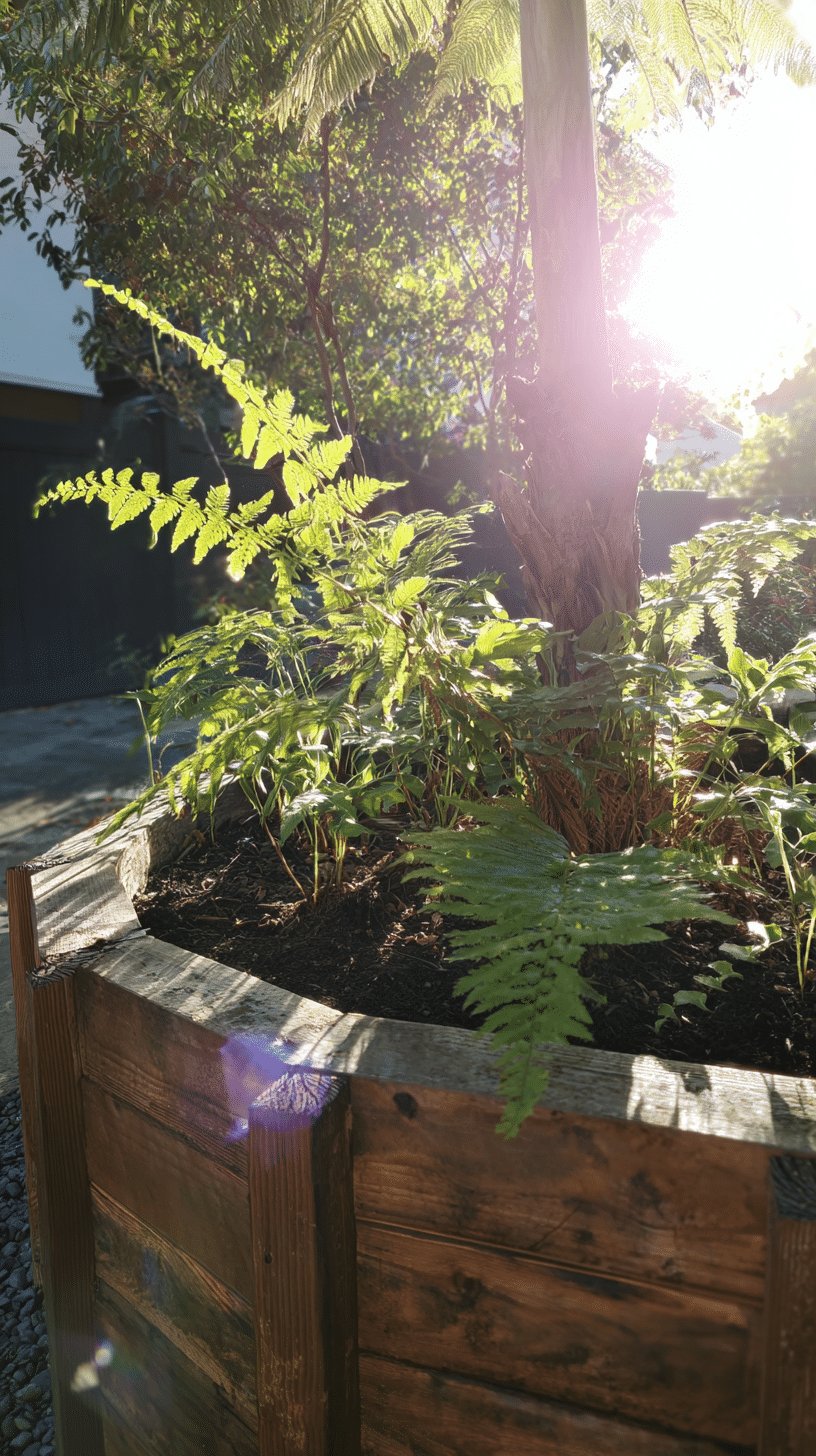 The tree’s textured trunk anchors the scene and the dappling sunlight through the canopy makes every frond look like a tiny celebration. It reads rustic and calm, like someone pressed pause on a woodland and dropped it into the backyard.