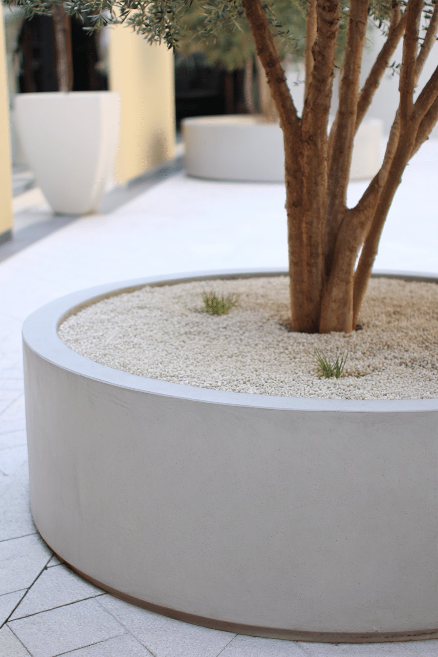 I love how this low, circular concrete planter turns a tree trunk into a calm, sculptural centerpiece. The smooth pale finish and white pebble mulch read modern and relaxed, and those tiny grassy tufts peek through like little green confetti. It feels effortless but intentional, like someone styled the space without trying too hard.